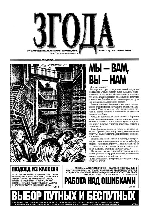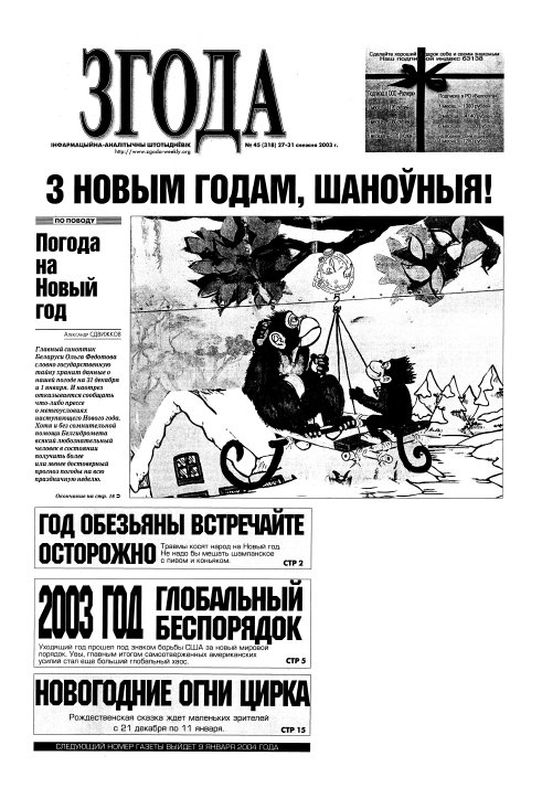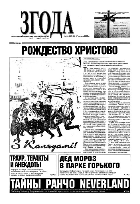 Штотыднёвая газета “Згода” выходзіла з ліпеня 1992 года па сакавік 2006 года. З’яўлялася адным з першых незалежных грамадска-палітычных выданняў у Беларусі з накладам ад 5да 40 тыс. асобнікаў у моманты грамадскай актыўнасці. Заснавальнік і галоўны рэдактар Аляксей Кароль. Пасля першых прэзідэнцкіх выбараў у 1994 годзе і ўсталяваннем ў краіне аўтарытарнага рэжыму, рэдакцыя газеты знаходзілася пад пастаянным эканамічным і палітычным ціска... Болей »