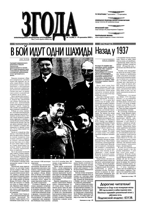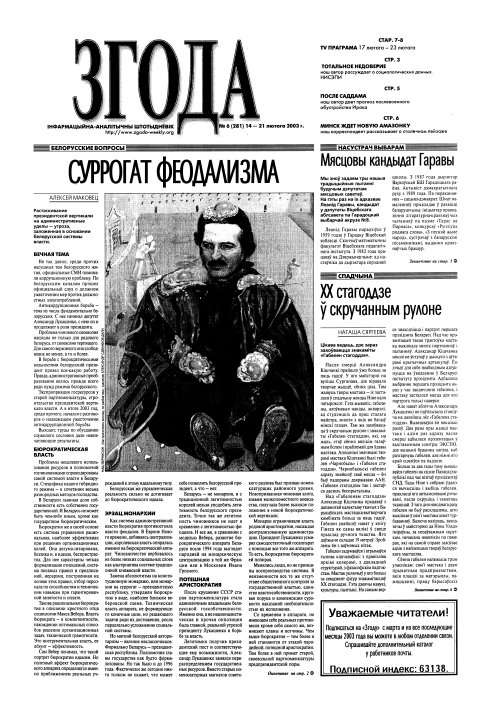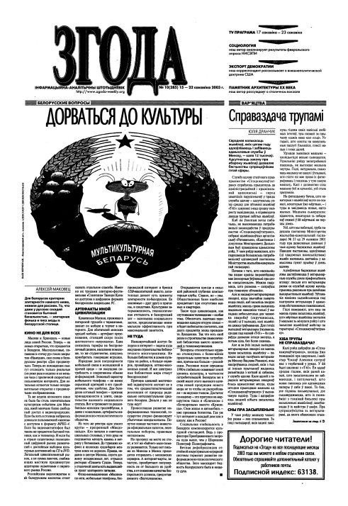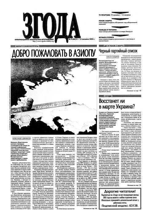 Штотыднёвая газета “Згода” выходзіла з ліпеня 1992 года па сакавік 2006 года. З’яўлялася адным з першых незалежных грамадска-палітычных выданняў у Беларусі з накладам ад 5да 40 тыс. асобнікаў у моманты грамадскай актыўнасці. Заснавальнік і галоўны рэдактар Аляксей Кароль. Пасля першых прэзідэнцкіх выбараў у 1994 годзе і ўсталяваннем ў краіне аўтарытарнага рэжыму, рэдакцыя газеты знаходзілася пад пастаянным эканамічным і палітычным ціска... Болей »
