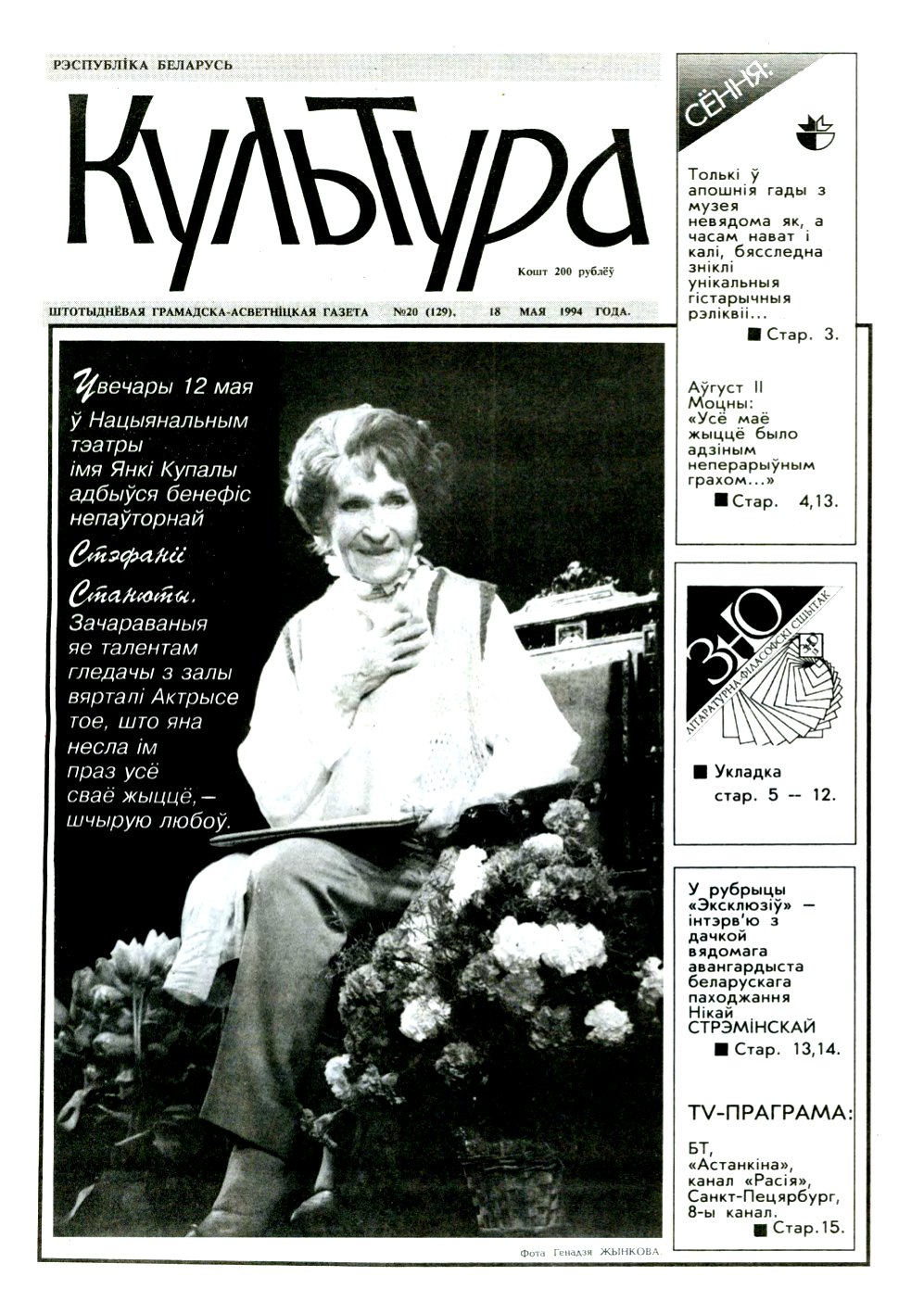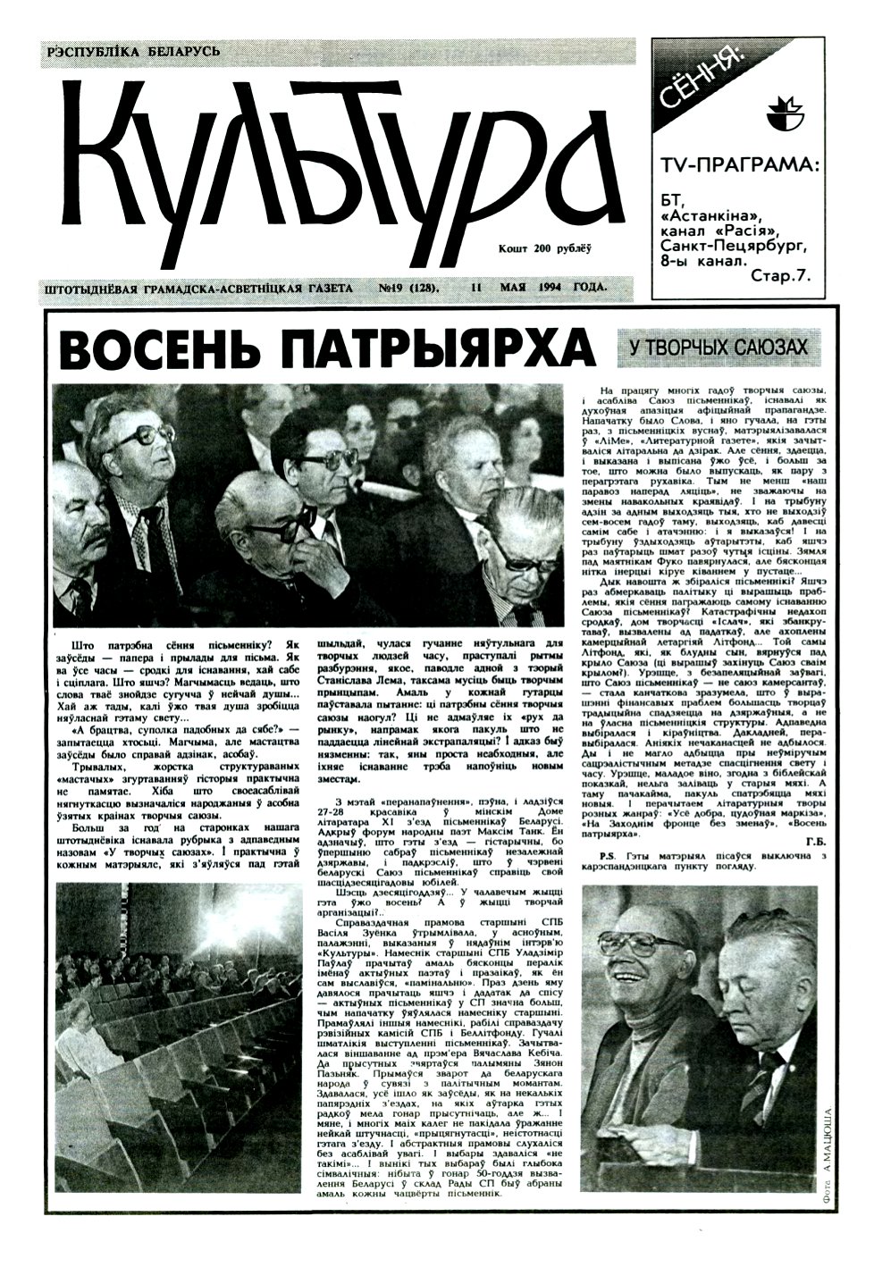 «Культура» — штотыднёвая грамадска-асветніцкая газета. Выдаецца з кастрычніка 1991 года ў Мінску на беларускай мове. Заснавальнік — Міністэрства культуры Рэспублікі Беларусь. З 2002 года з'яўляецца часткай рэдакцыйна-выдавецкай ўстановы «Культура і мастацтва», куды ўваходзіць разам з часопісам «Мастацтва». Галоўныя рэдактары: Вольга Іпатава (1991—1995), Людміла Крушынская (1995—2012), Сяргей Трафілаў (2012—2017), Ілья Сін (з 2017).<a hr... Болей »