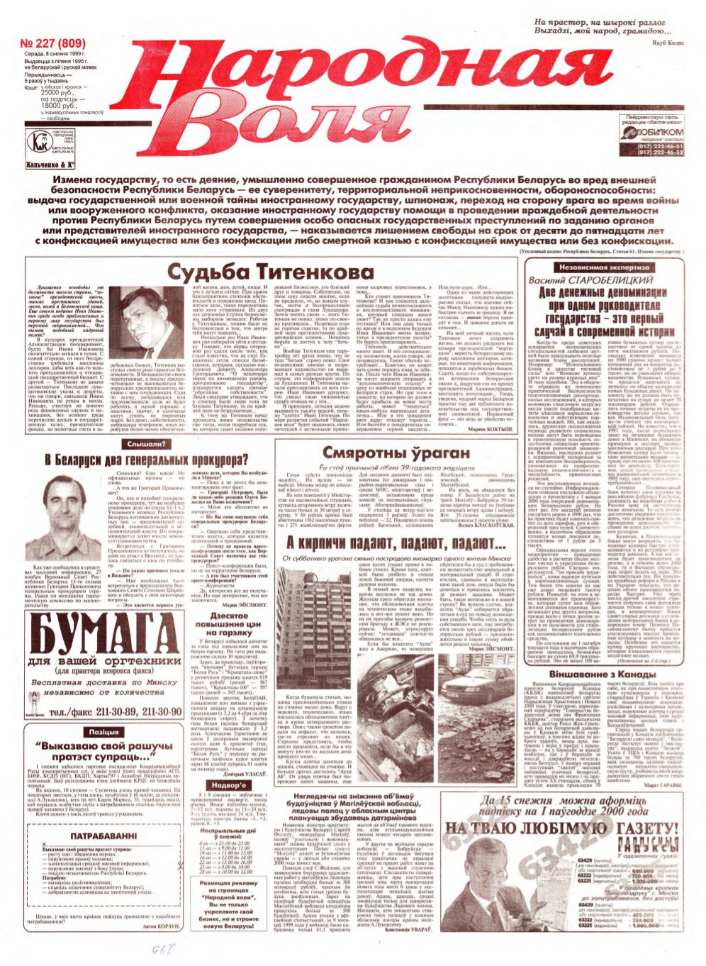 Народная Воля, 227 (809) 1999