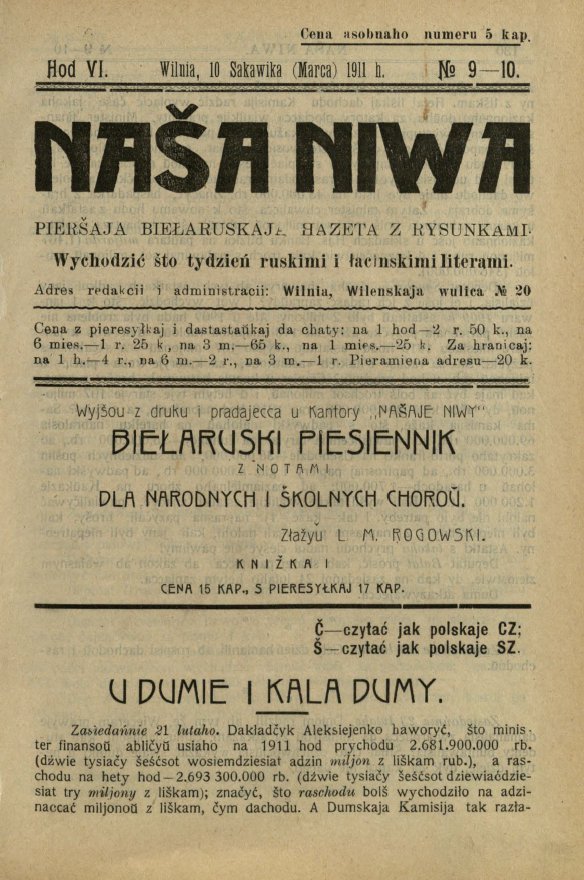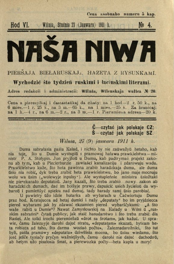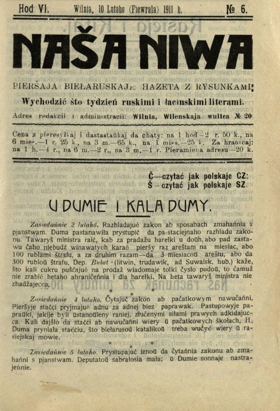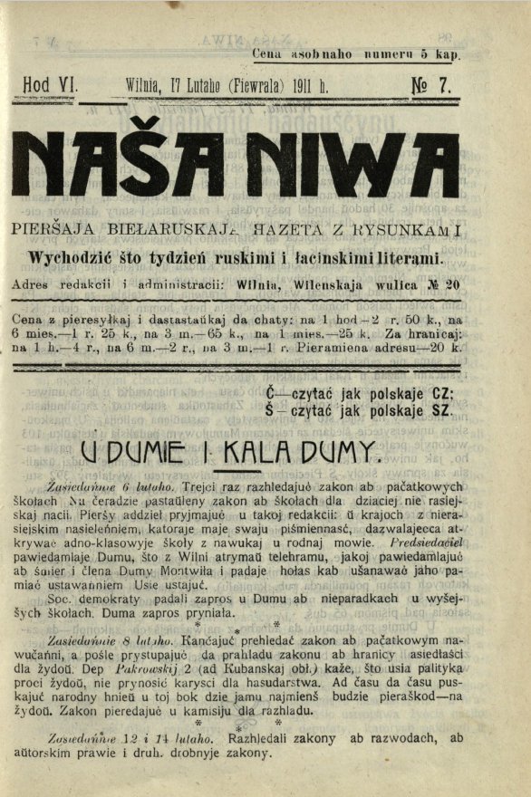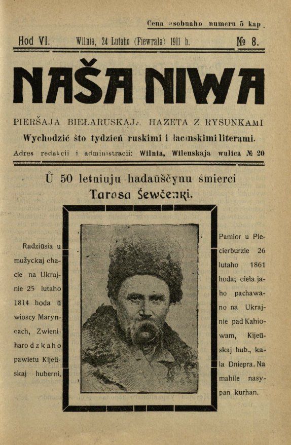 «Наша ніва» (тагач. лац. «Nasza niwa») — штотыднёвая грамадска-палітычная, навукова-асветніцкая і літаратурна-мастацкая газета нацыяльна-адраджэнскага кірунку. Выдавалася ў Вільні, па-беларуску, у перыяд 10 (23).11.1906 — 7 (20).8.1915. Друкавалася кірыліцай, да 18 (31).10.1912 таксама і лацінкай. Звычайны тыраж складаў 4.5 тыс. асобнікаў. Выхад газеты быў спынены ў сувязі з набліжэннем расійска-нямецкага фронту да Вільні. Заснавальнікі... Болей »