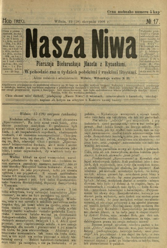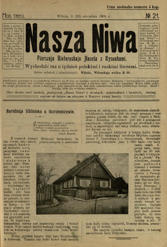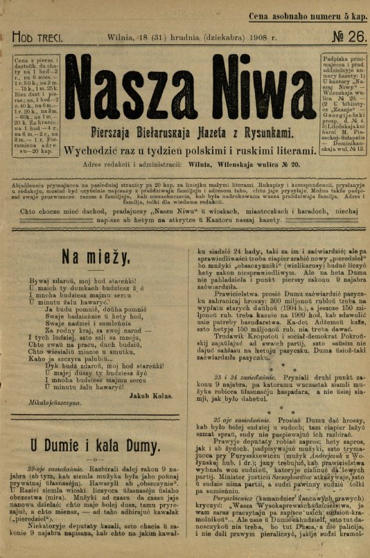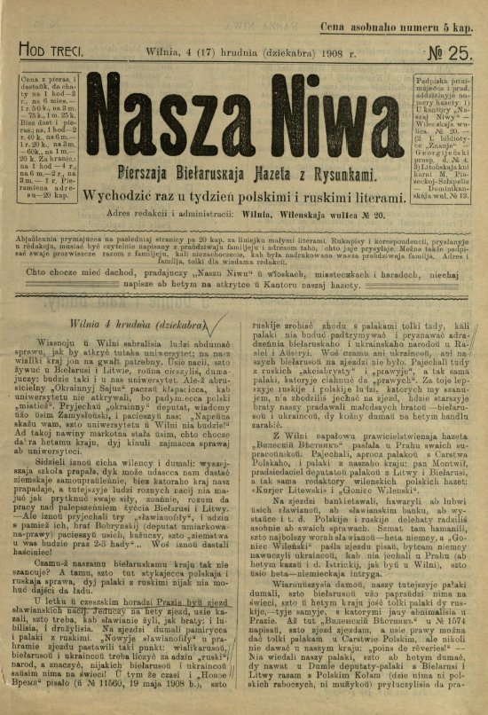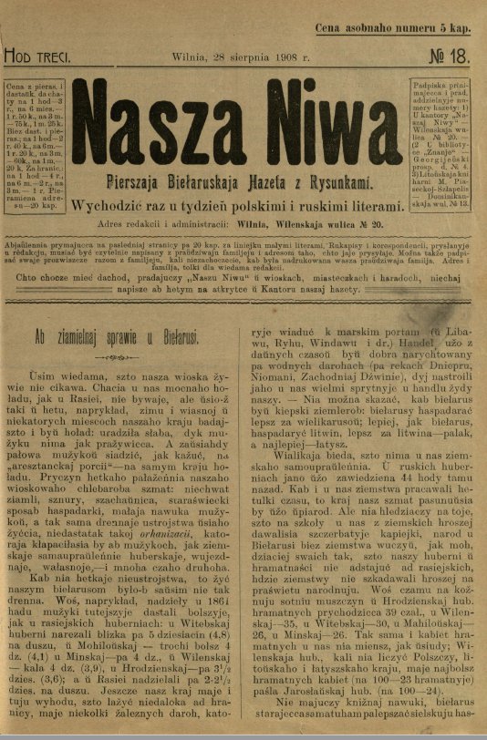 «Наша ніва» (тагач. лац. «Nasza niwa») — штотыднёвая грамадска-палітычная, навукова-асветніцкая і літаратурна-мастацкая газета нацыяльна-адраджэнскага кірунку. Выдавалася ў Вільні, па-беларуску, у перыяд 10 (23).11.1906 — 7 (20).8.1915. Друкавалася кірыліцай, да 18 (31).10.1912 таксама і лацінкай. Звычайны тыраж складаў 4.5 тыс. асобнікаў. Выхад газеты быў спынены ў сувязі з набліжэннем расійска-нямецкага фронту да Вільні. Заснавальнікі... Болей »