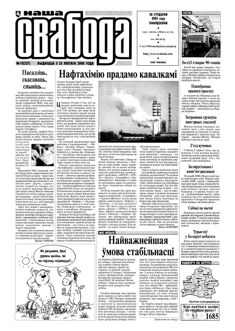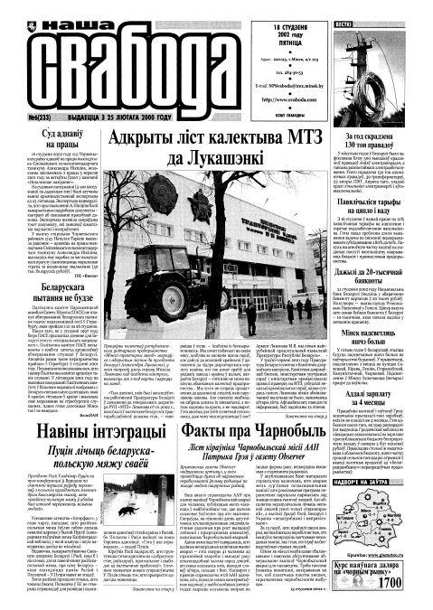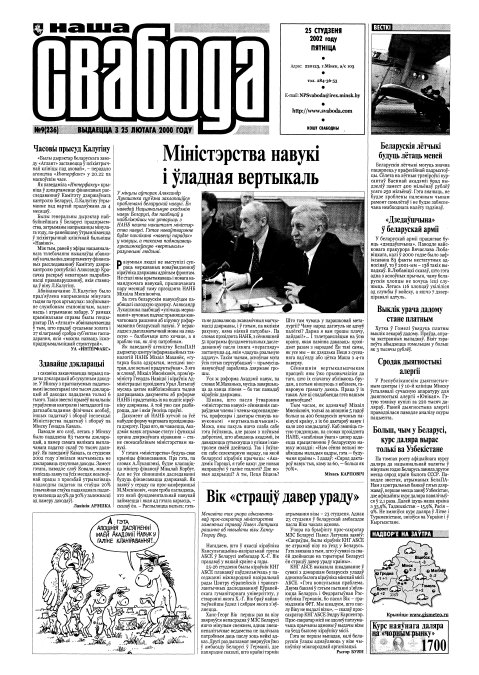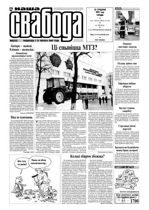 Наша Свабода — грамадска-палітычная газета, якая выдавалася пад гэтай назвай з 2000 па 2002 ў Мінску на беларускай мове. Заснавальнік, галоўны і першы рэдактар — Павел Жук. 24 лістапада 1997 году Вышэйшы гаспадарчы суд зьліквідаваў газэту «Свабода». З 16 студзеня 1998 году «Свабода» пачала выходзіць пад назвай «Навіны». 24 верасьня 1999 году суд задаволіў зыск Дзяржаўнага сакратара Рады Бясьпекі Віктара Шэймана да газэты й журналіста Ся... Болей »