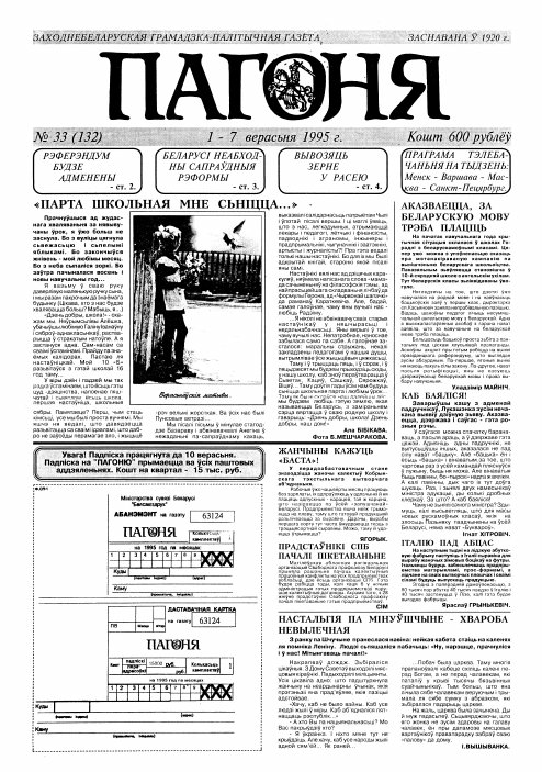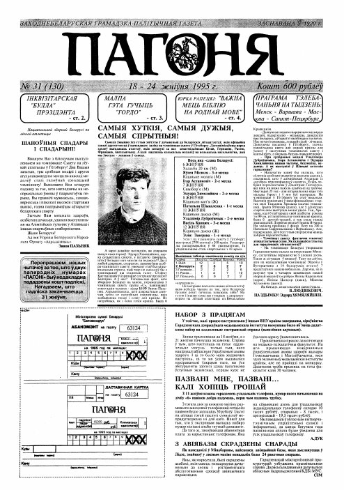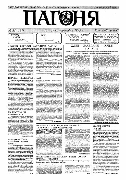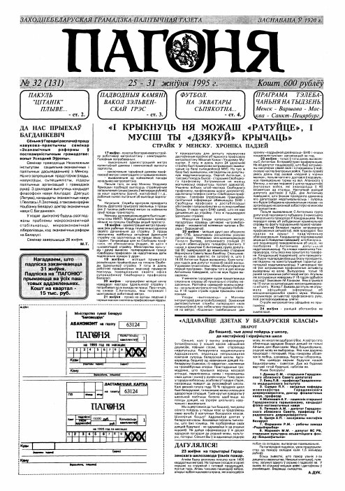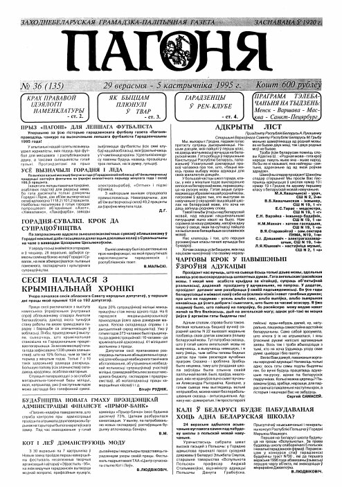 Пагоня — беларускамоўная незалежная газэта, якая выдавалася ад 25 сакавіка 1992 да 12 лістапада 2001 году ў Горадні. Першы нумар выйшаў 25 сакавіка 1992, на Дзень Волі: выдаў яго Сяргей Астраўцоў. З 1993 году газэта пачала выходзіць рэгулярна па пятніцах з пазнакаю: «Рэгіянальны агляд: Беласток-Горадня-Вільня». Пад час прэзыдэнцкіх выбараў 1994 актыўна падтрымала Зянона Пазьняка, востра крытыкавала Лукашэнку. Першая зь беларускіх СМІ зь... Болей »
