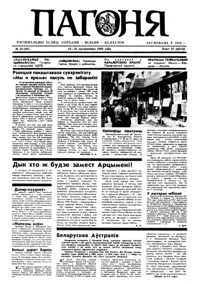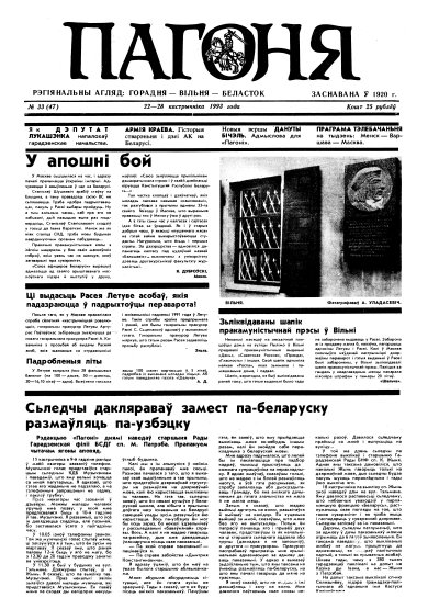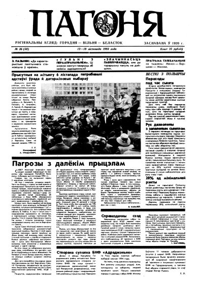 Пагоня — беларускамоўная незалежная газэта, якая выдавалася ад 25 сакавіка 1992 да 12 лістапада 2001 году ў Горадні. Першы нумар выйшаў 25 сакавіка 1992, на Дзень Волі: выдаў яго Сяргей Астраўцоў. З 1993 году газэта пачала выходзіць рэгулярна па пятніцах з пазнакаю: «Рэгіянальны агляд: Беласток-Горадня-Вільня». Пад час прэзыдэнцкіх выбараў 1994 актыўна падтрымала Зянона Пазьняка, востра крытыкавала Лукашэнку. Першая зь беларускіх СМІ зь... Болей »