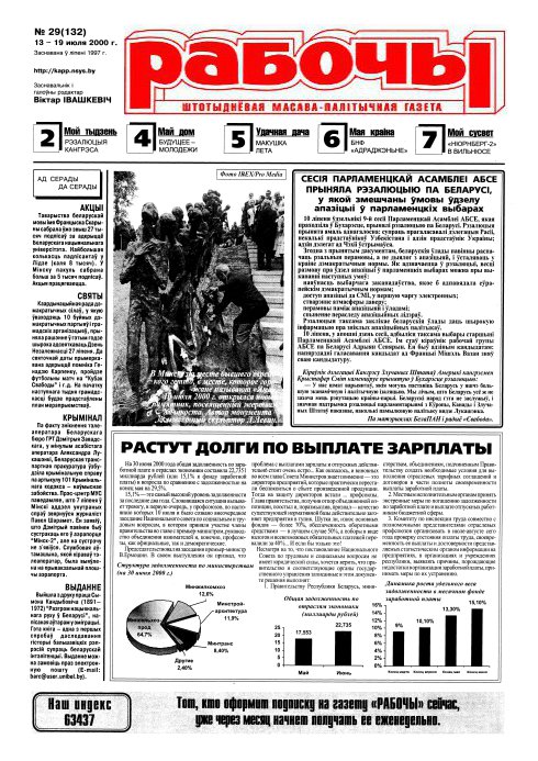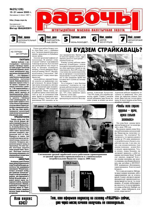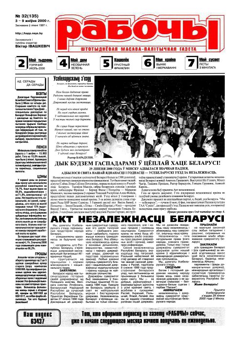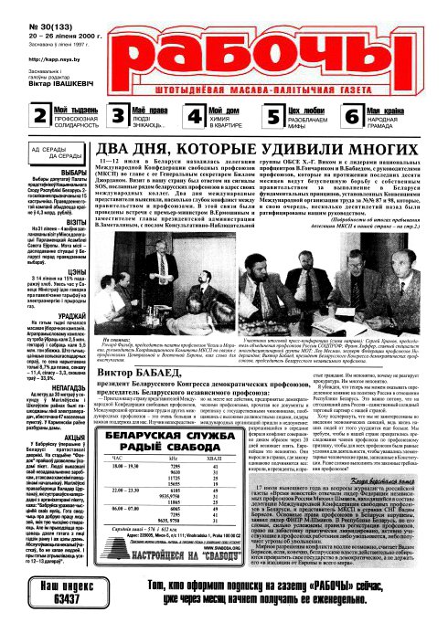“Рабочы” (1997–2002 гг.) - Бюлетень Свабоднага прафсаюза беларусскага і Камітэта абароны правоў працоўных. Пазьней Газета Камітэта абароны правоў працоўных і Штотыднёвая масава-палітычная газета. Галоўным рэдактарам газэты “Рабочы” быў Віктар Івашкевіч — вядомы палітычны дзяяч і журналіст. 16 сьнежня 2002 г. Віктар Івашкевіч быў арыштаваны, а праз некаторы час — асуджаны да аднаго году абмежаваньня волі за паклёп на прэзыдэнта і яго ата... Болей »