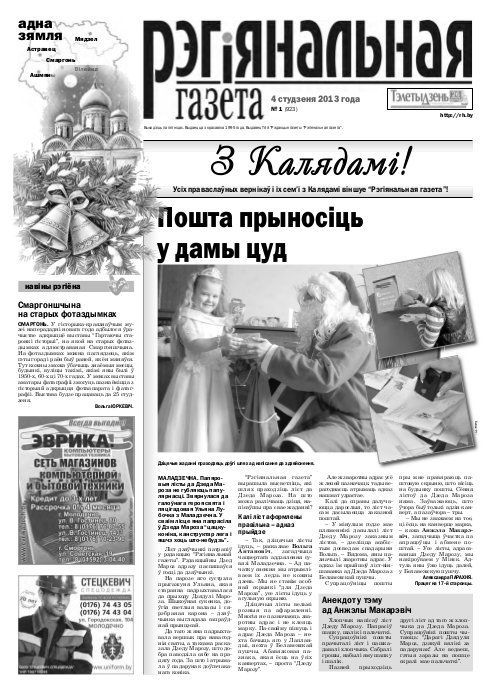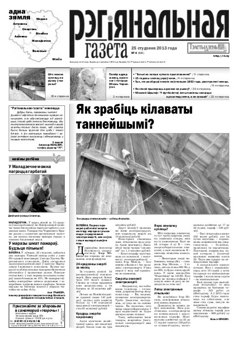 “Рэгіянальная газета” – недзяржаўнае выданне, якое не з’яўляецца выразнікам інтарэсаў і пазіцый якой-небудзь палітычнай партыі, рэлігійнай канфесіі, органаў улады. У сваіх публікацыях па пытаннях эканомікі, палітыкі, культуры, гісторыі, рэлігіі рэдакцыя захоўвае незалежную непрадузятасць і павагу да праўды, у роўнай ступені паказвае супрацьлеглыя пункты гледжання, пазбягаючы тэндэнцыйнасці. Выданне разлічанае на масавага чытача рознага ... Болей »