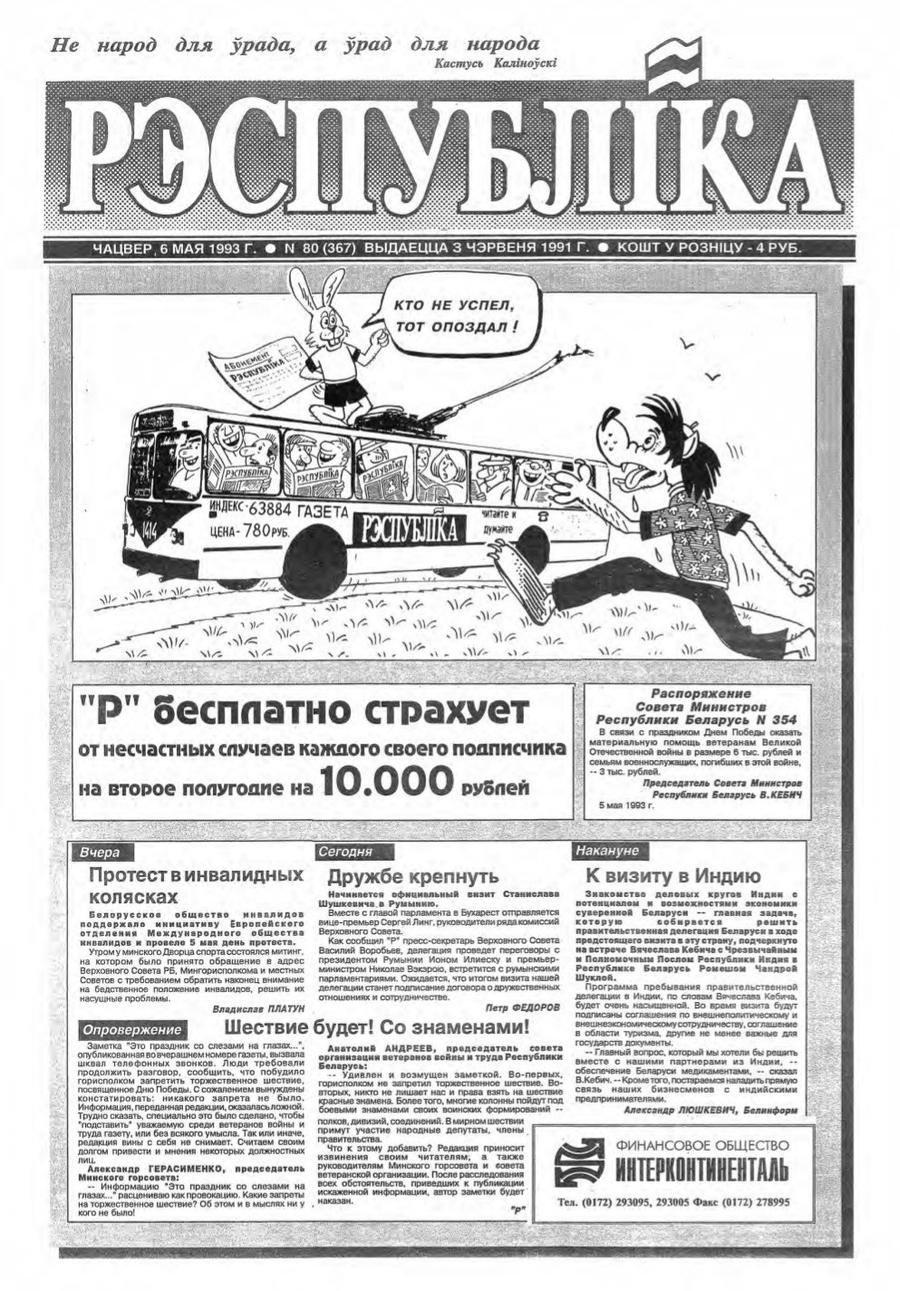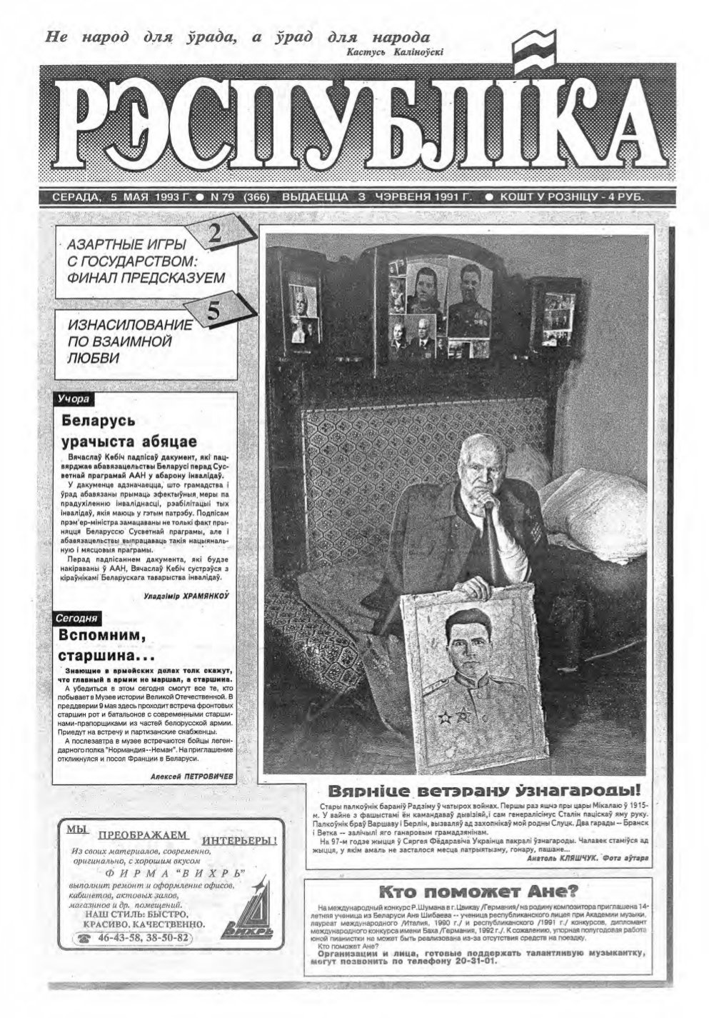 «Рэспубліка» — газета для тых, хто самастойна прымае рашэнні. Заснавальнік - Савет Міністраў Рэспублікі Беларусь. Выдаецца з чэрвеня 1991. Газета выходзіць 250 разоў у год. Аўтары апублікаваных матэрыялаў нясуць адказнасць за падбор і дакладнасць фактаў, іх меркаванні неабавязкова адлюстроўваюць пункт гледжання рэдакцыі. Рукапісы, фотаздымкі і малюнкі не рэцэнзуюцца I не вяртаюцца. Болей »