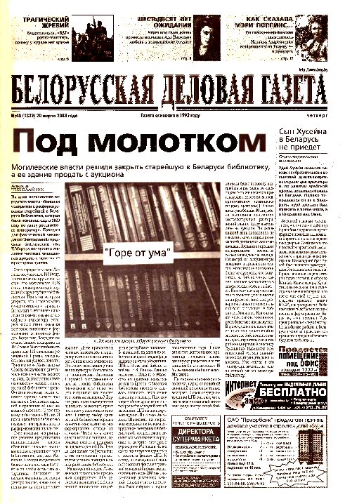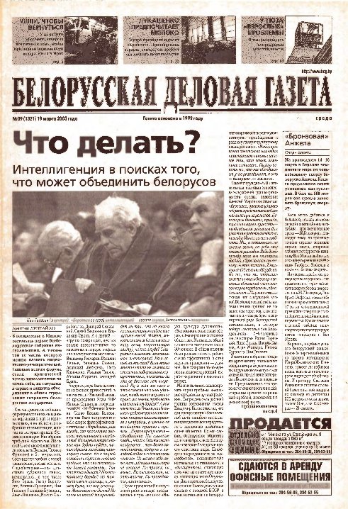 «Белорусская деловая газета» (па-беларуску: «Беларуская дзелавая газэта») — беларуская грамадзка-палітычная газэта, заснаваная ў 1992 годзе. Заснавальнікам і выдаўцом «БДГ» зьяўляецца Выдавецкае прыватнае вунітарнае прадпрыемства «Марат». «БДГ» — штодзённае незалежнае выданьне дзелавых і палітычных кругоў Беларусі. «БДГ» зьяўляецца адным з найболей аўтарытэтных незалежных СМІ Беларусі. За час дзейнасьці газэты ўладамі неаднаразова прадп... Болей »