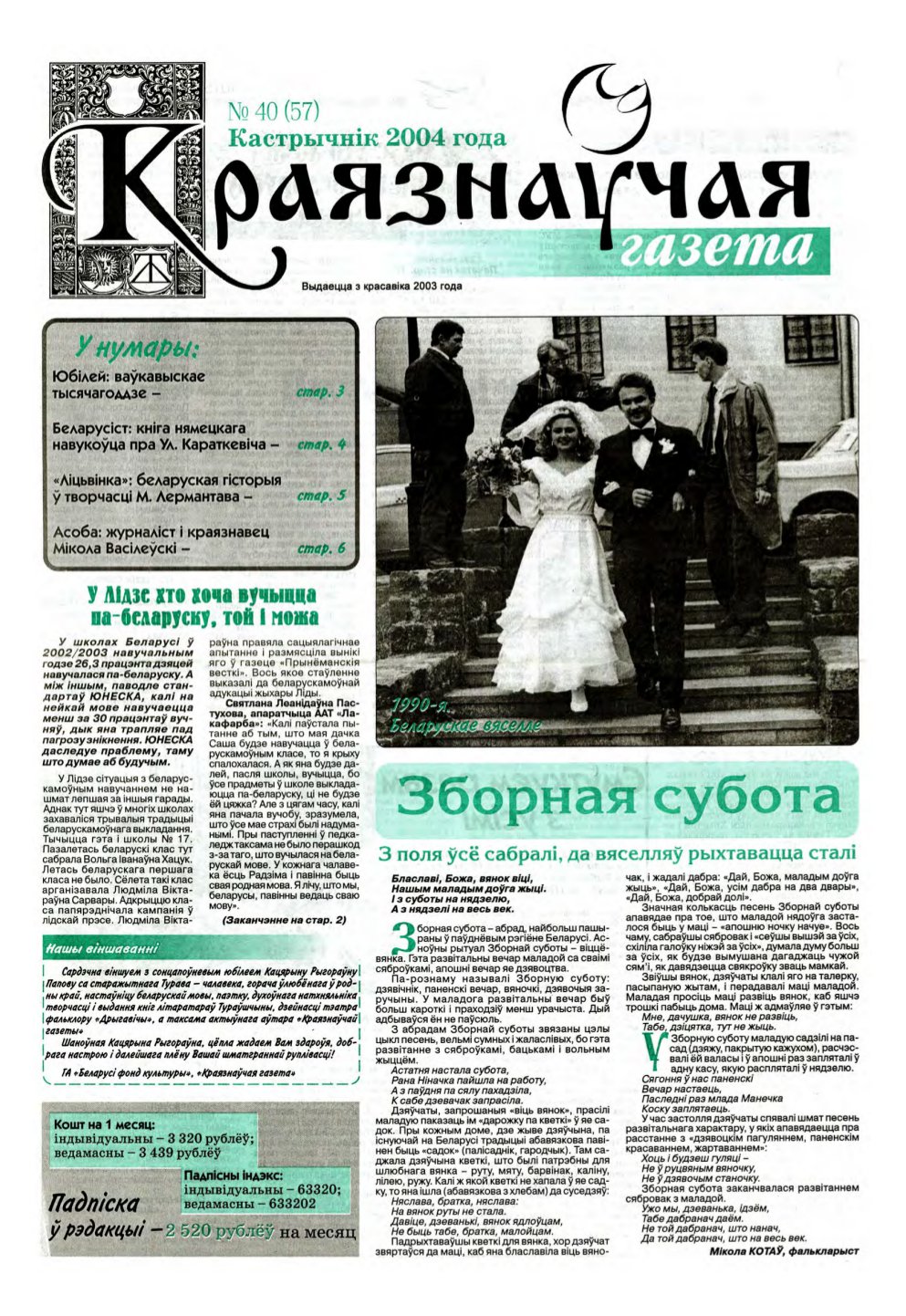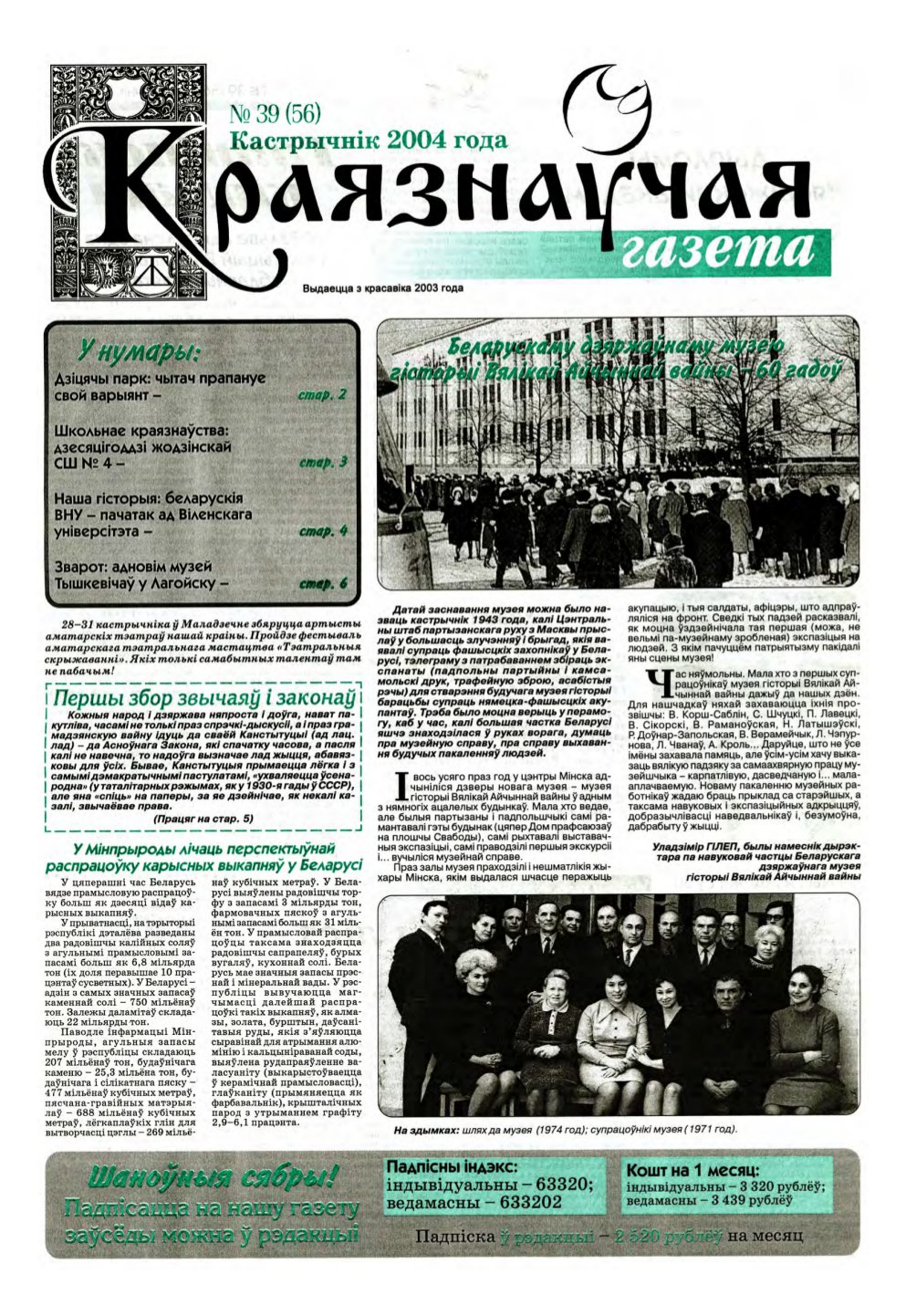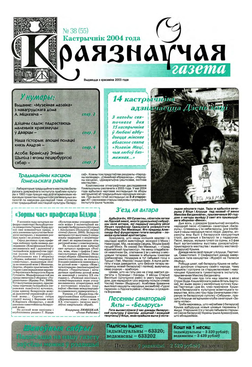 «Краязнаўчая газета» выдаецца з красавіка 2003 г. Штомесяц выходзіць чатыры нумары. На старонках выдання змяшчаюцца артыкулы мясцовых краязнаўцаў, прысвечаныя гісторыі і традыцыям рэгіёнаў нашай краіны, даследаванні навукоўцаў пра гісторыю, этнаграфію, фальклор і архітэктуру, пра гістарычныя падзеі і асобаў, а таксама расповяды пра нашых землякоў, якія праславіліся не толькі ў ў Беларусі, але і за яе межамі. Асобная ўвага надаецца публі... Болей »