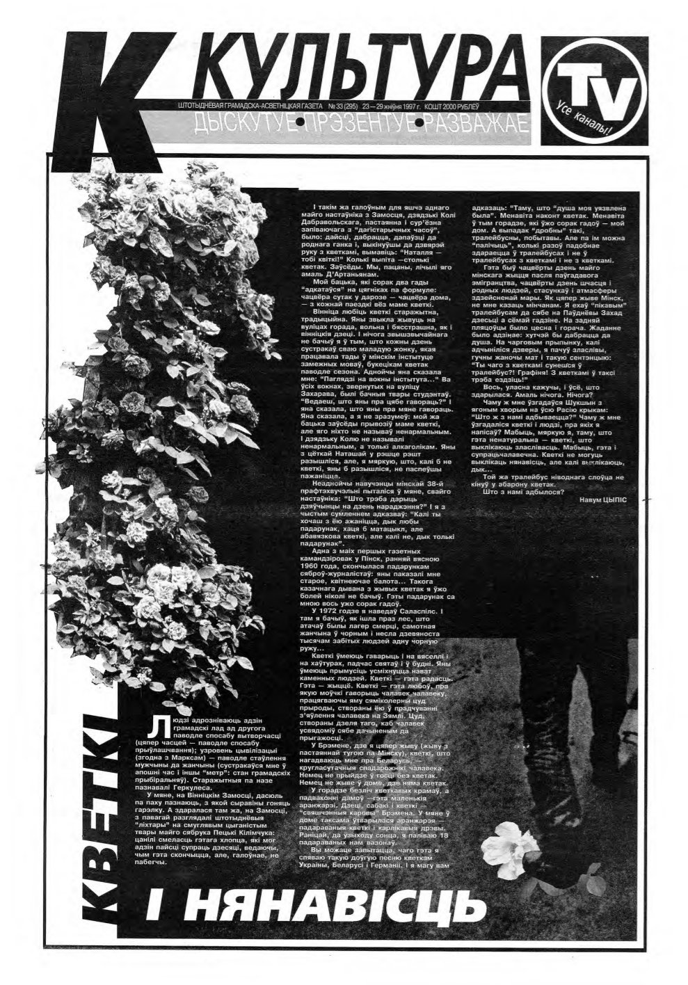 «Культура» — штотыднёвая грамадска-асветніцкая газета. Выдаецца з кастрычніка 1991 года ў Мінску на беларускай мове. Заснавальнік — Міністэрства культуры Рэспублікі Беларусь. З 2002 года з'яўляецца часткай рэдакцыйна-выдавецкай ўстановы «Культура і мастацтва», куды ўваходзіць разам з часопісам «Мастацтва». Галоўныя рэдактары: Вольга Іпатава (1991—1995), Людміла Крушынская (1995—2012), Сяргей Трафілаў (2012—2017), Ілья Сін (з 2017).<a hr... Болей »
