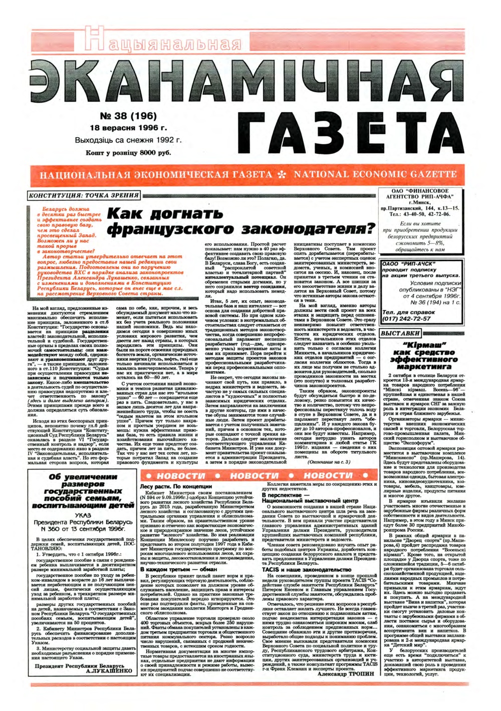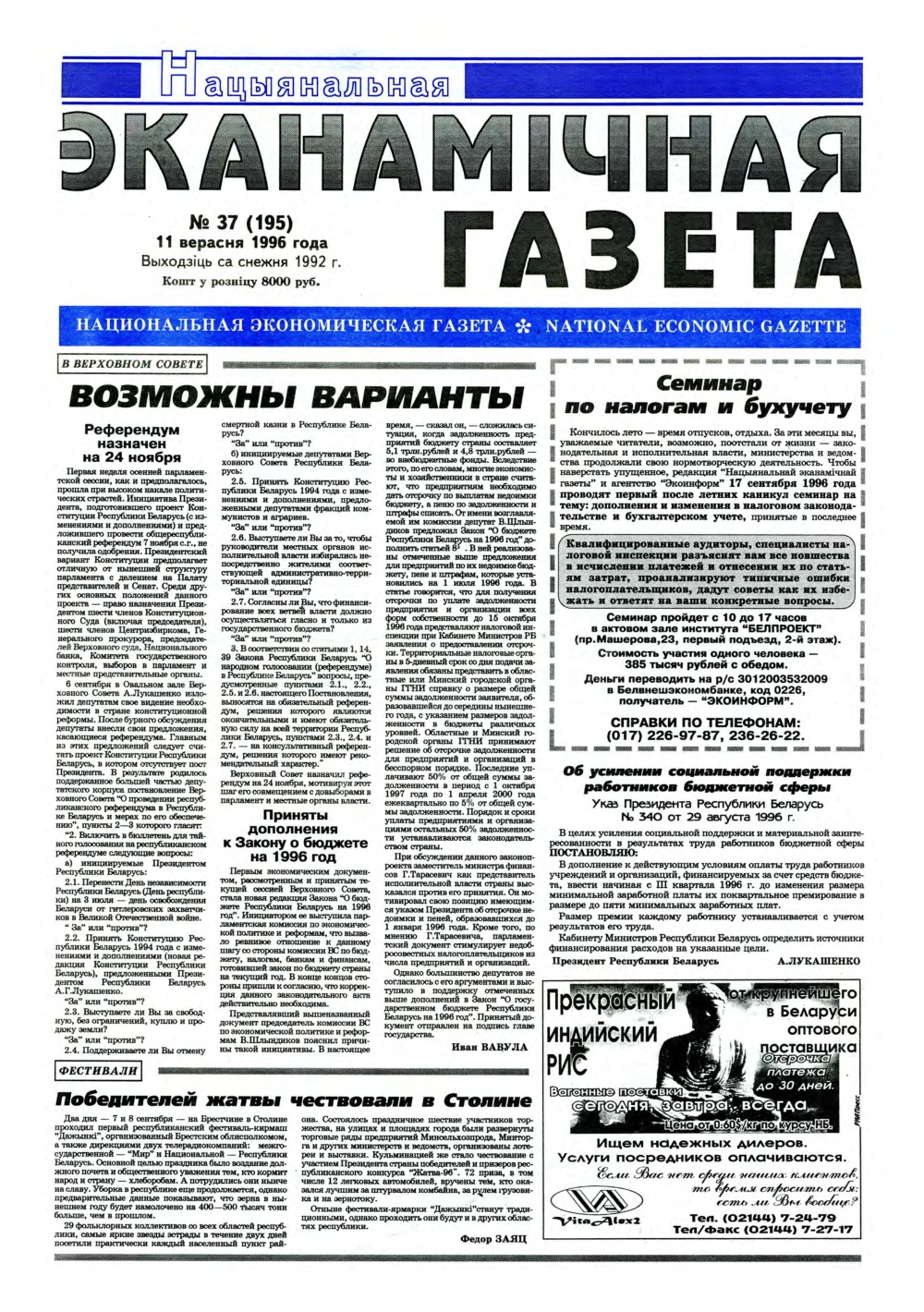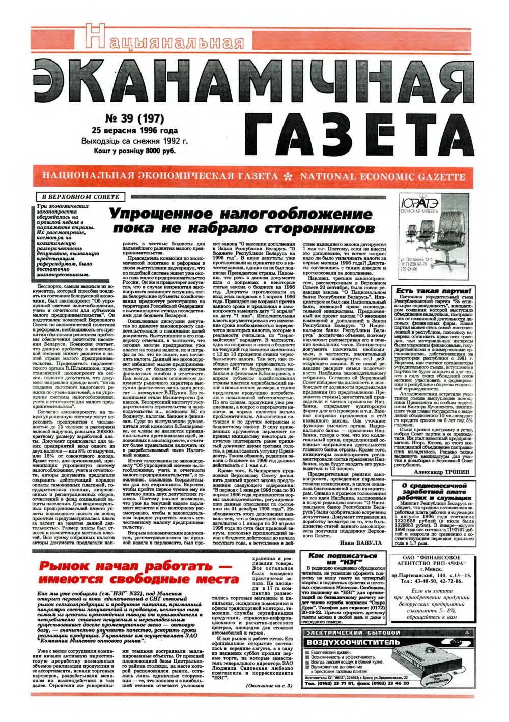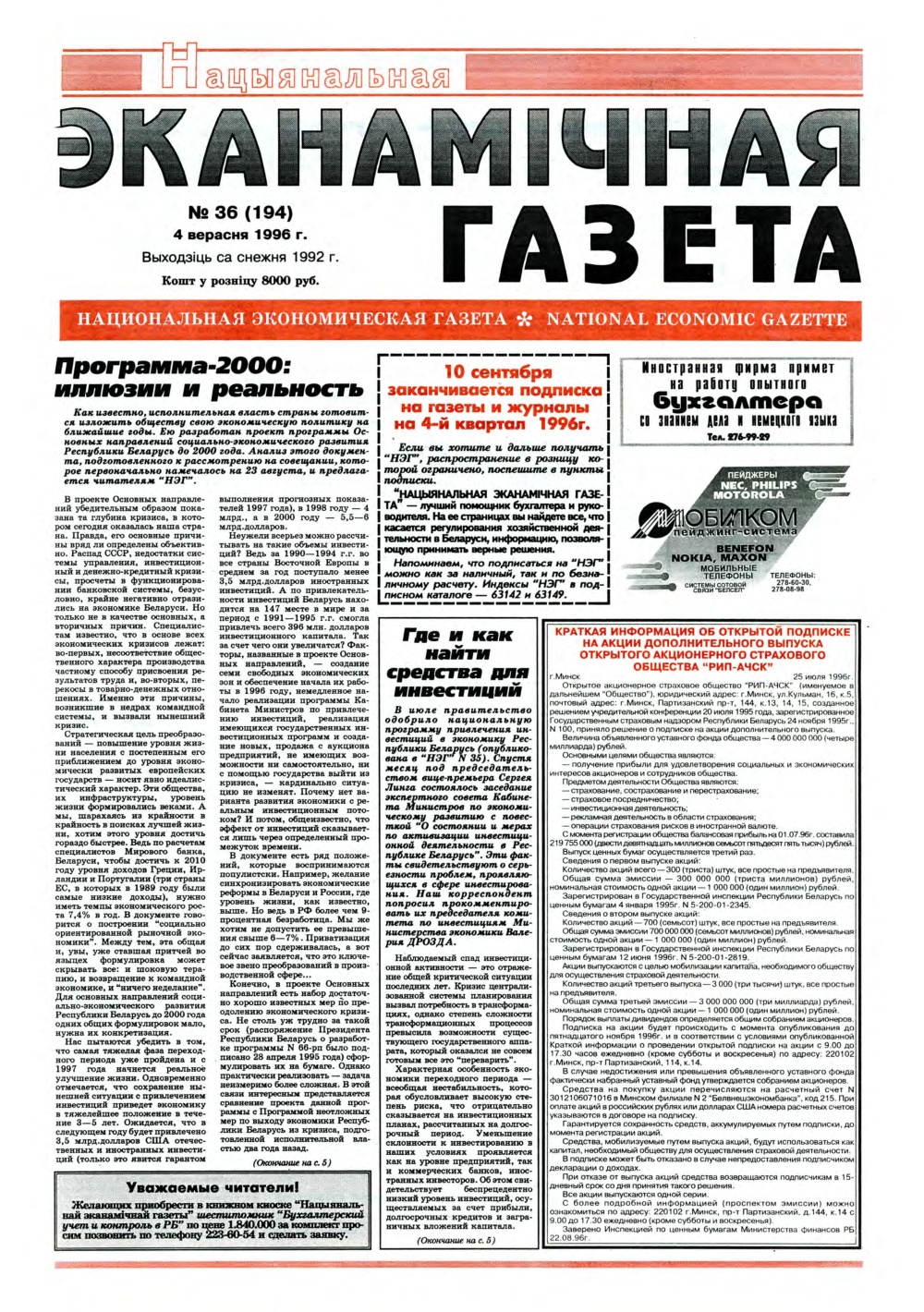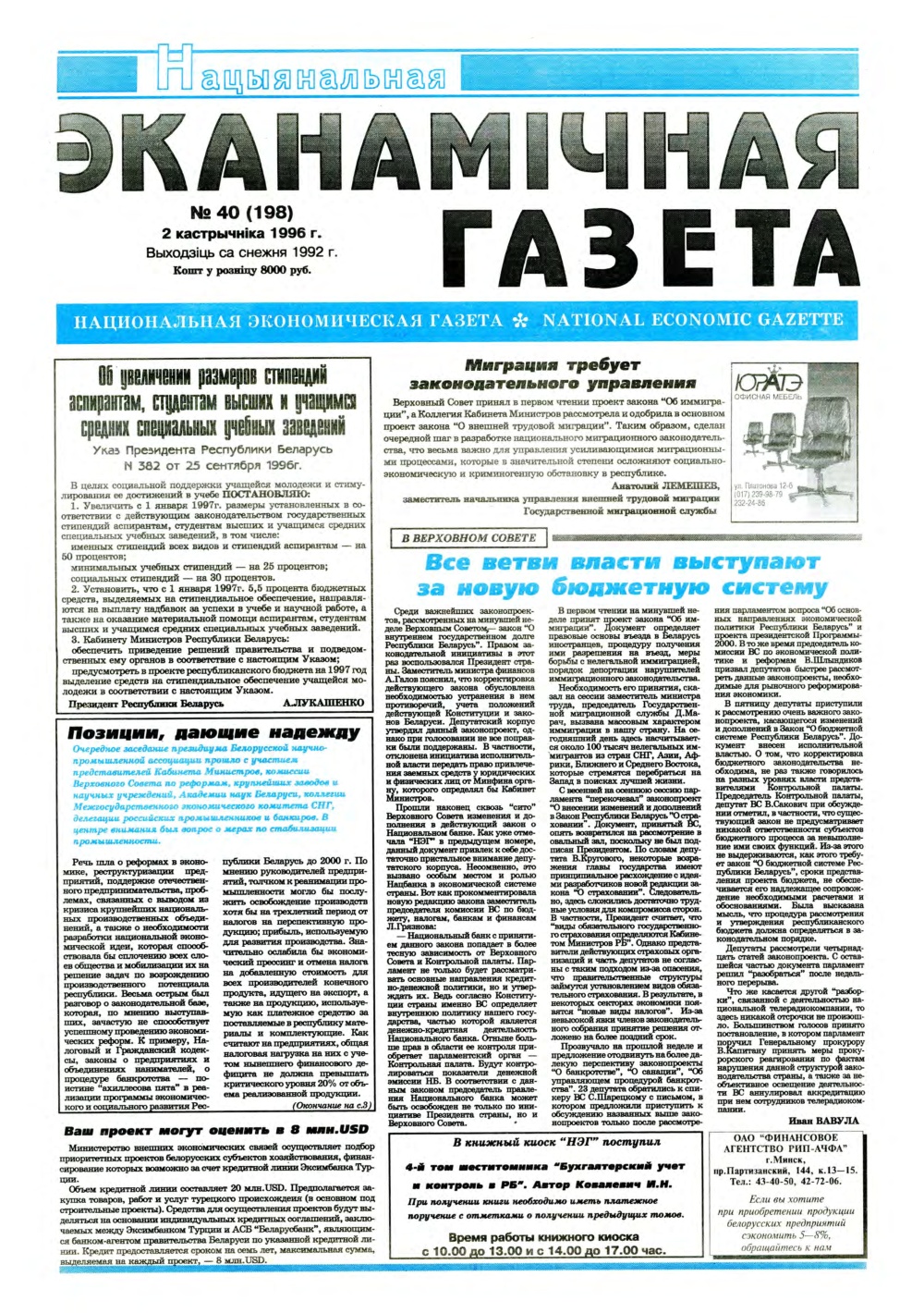 «Нацыянальная эканамічная газета» — «Нацыянальная эканамічная газета» — заснаваная часопісам «Чалавек і эканоміка». Найстарэйшае эканамічнае выданне ў Рэспубліцы Беларусь. Выходзіць са снежня 1992 года. Газета адной з першых узялася за эканамічную адукацыю, выхаванне спецыялістаў новай фармацыі ў перыяд пераходу ад адміністрацыйна-каманднай сістэмы гаспадарання да рынку. Праблемы макраэканомікі і фінансаў, бухгалтарскага ўліку і падатка... Болей »