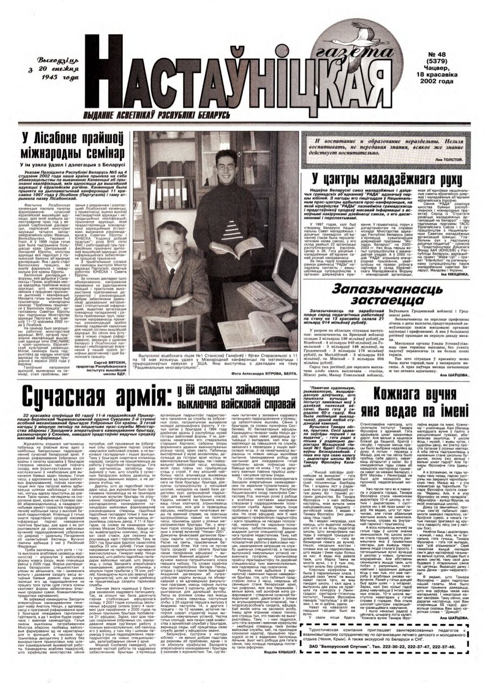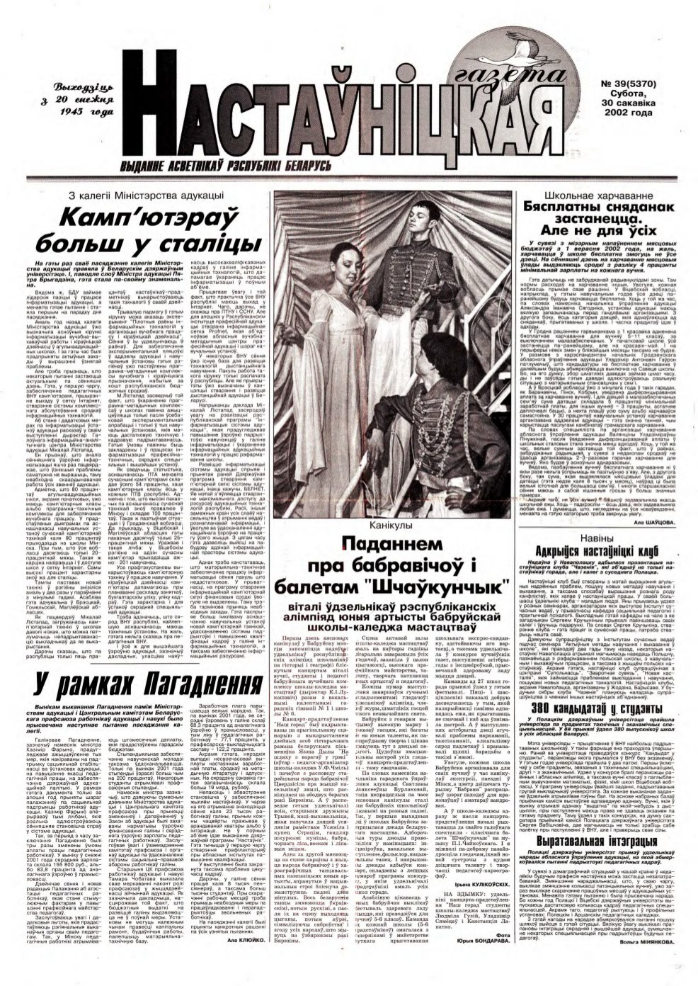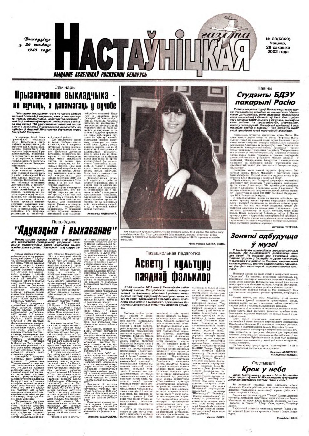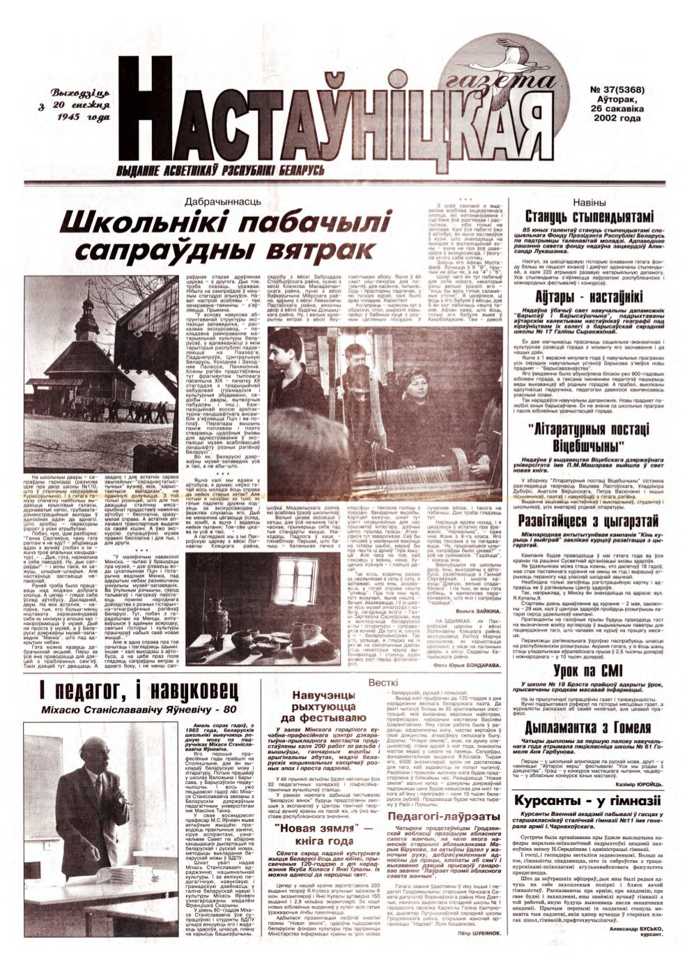 «Настаўніцкая газета» — выданне асветнікаў Рэспублікі Беларусь. Заснавана Міністэрствам адукацыі Рэспублікі Беларусь, выдаецца рэдакцыйна-выдавецкай установай «Выдавецкі дом „Педагагічная прэса“». Выходзіць з 20 снежня 1945 года ў Мінску на беларускай мове (да 1957 года — 1 раз, з 1958 года — 2 разы, з 1998 года — 3 разы на тыдзень). У ліпені 2022 года газета стала выходзіць 2 разы на тыдзень, што значна зменшыла агульны аб’ём выдання. ... Więcej »