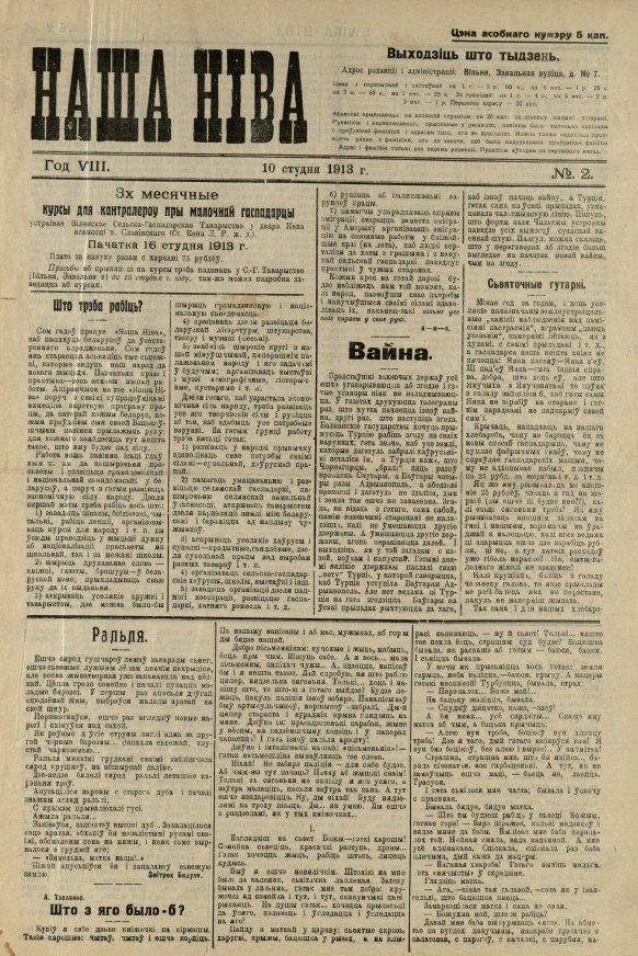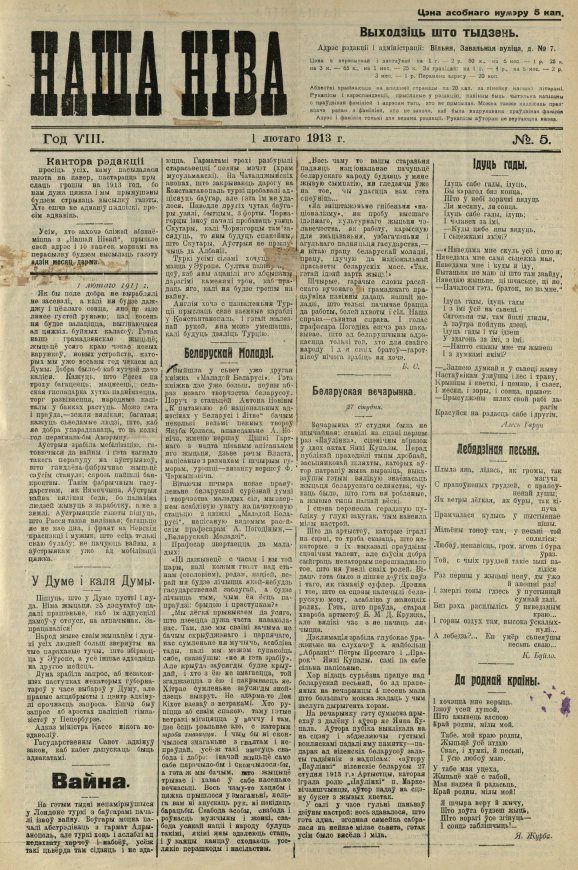 «Наша ніва» (тагач. лац. «Nasza niwa») — штотыднёвая грамадска-палітычная, навукова-асветніцкая і літаратурна-мастацкая газета нацыяльна-адраджэнскага кірунку. Выдавалася ў Вільні, па-беларуску, у перыяд 10 (23).11.1906 — 7 (20).8.1915. Друкавалася кірыліцай, да 18 (31).10.1912 таксама і лацінкай. Звычайны тыраж складаў 4.5 тыс. асобнікаў. Выхад газеты быў спынены ў сувязі з набліжэннем расійска-нямецкага фронту да Вільні. Заснавальнікі... Болей »