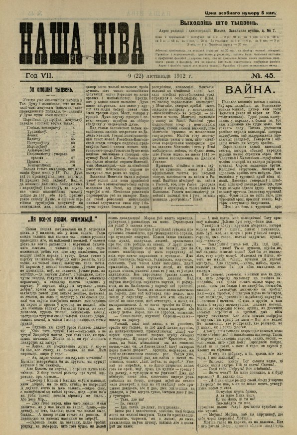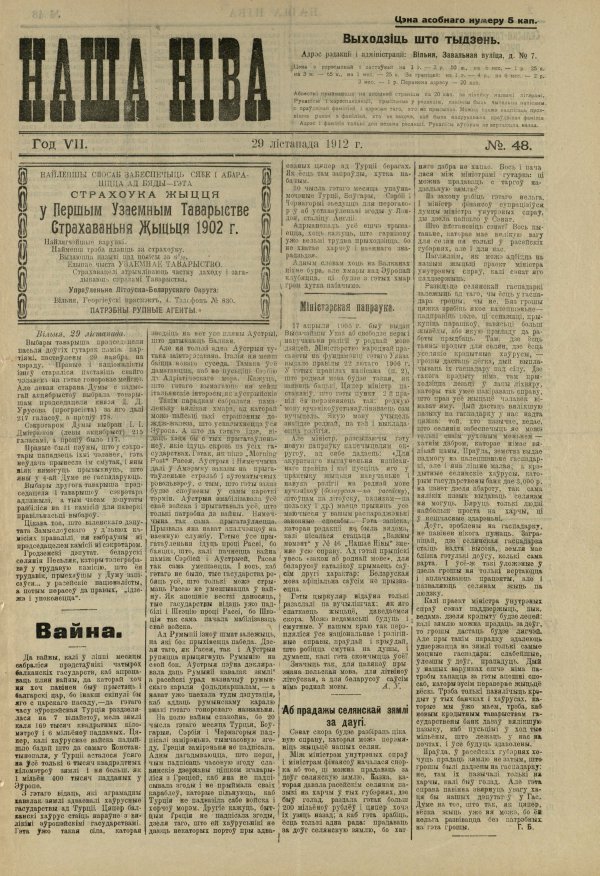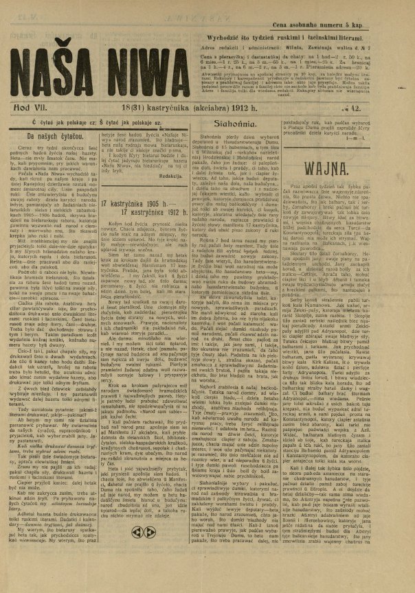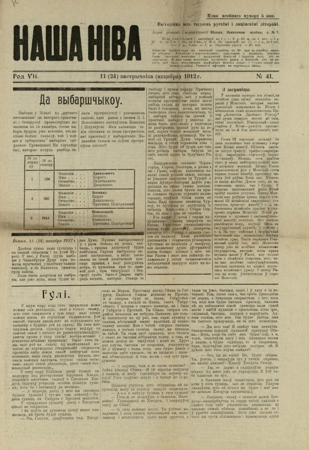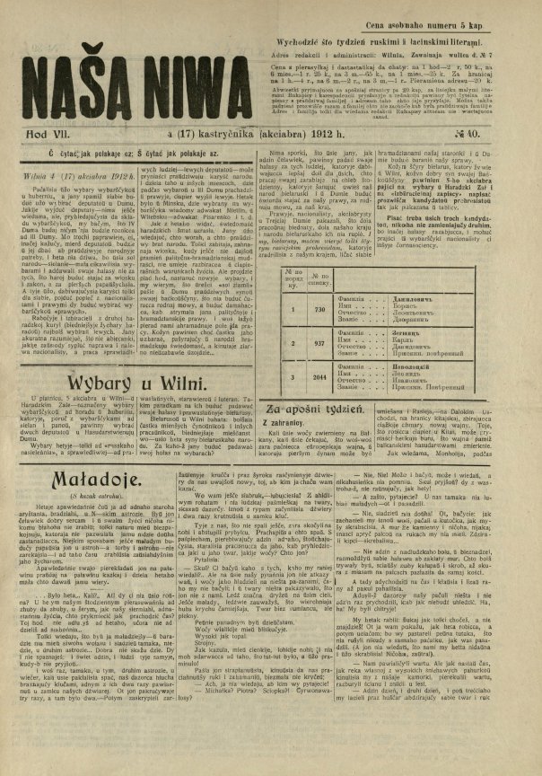 «Наша ніва» (тагач. лац. «Nasza niwa») — штотыднёвая грамадска-палітычная, навукова-асветніцкая і літаратурна-мастацкая газета нацыяльна-адраджэнскага кірунку. Выдавалася ў Вільні, па-беларуску, у перыяд 10 (23).11.1906 — 7 (20).8.1915. Друкавалася кірыліцай, да 18 (31).10.1912 таксама і лацінкай. Звычайны тыраж складаў 4.5 тыс. асобнікаў. Выхад газеты быў спынены ў сувязі з набліжэннем расійска-нямецкага фронту да Вільні. Заснавальнікі... Болей »