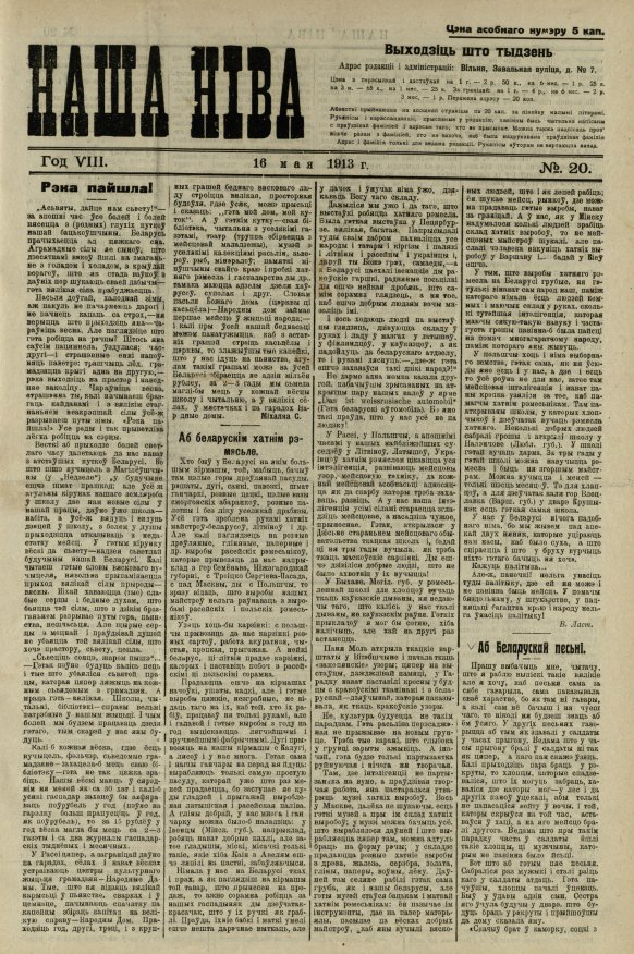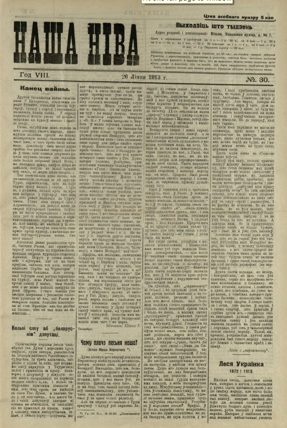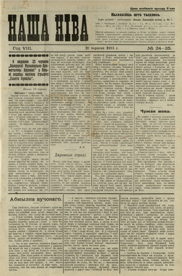 «Наша ніва» (тагач. лац. «Nasza niwa») — штотыднёвая грамадска-палітычная, навукова-асветніцкая і літаратурна-мастацкая газета нацыяльна-адраджэнскага кірунку. Выдавалася ў Вільні, па-беларуску, у перыяд 10 (23).11.1906 — 7 (20).8.1915. Друкавалася кірыліцай, да 18 (31).10.1912 таксама і лацінкай. Звычайны тыраж складаў 4.5 тыс. асобнікаў. Выхад газеты быў спынены ў сувязі з набліжэннем расійска-нямецкага фронту да Вільні. Заснавальнікі... Болей »
