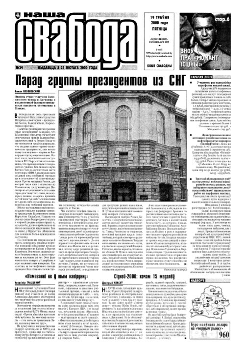 Наша Свабода — грамадска-палітычная газета, якая выдавалася пад гэтай назвай з 2000 па 2002 ў Мінску на беларускай мове. Заснавальнік, галоўны і першы рэдактар — Павел Жук. 24 лістапада 1997 году Вышэйшы гаспадарчы суд зьліквідаваў газэту «Свабода». З 16 студзеня 1998 году «Свабода» пачала выходзіць пад назвай «Навіны». 24 верасьня 1999 году суд задаволіў зыск Дзяржаўнага сакратара Рады Бясьпекі Віктара Шэймана да газэты й журналіста Ся... Болей »