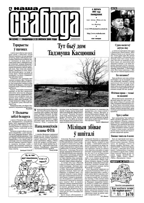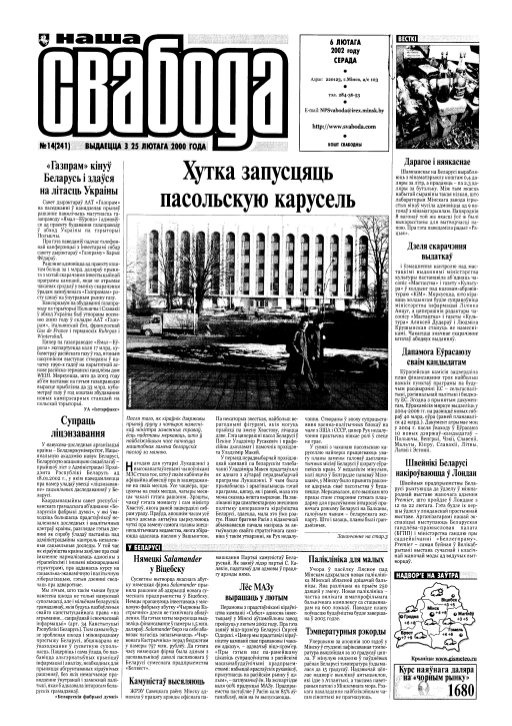 Наша Свабода — грамадска-палітычная газета, якая выдавалася пад гэтай назвай з 2000 па 2002 ў Мінску на беларускай мове. Заснавальнік, галоўны і першы рэдактар — Павел Жук. 24 лістапада 1997 году Вышэйшы гаспадарчы суд зьліквідаваў газэту «Свабода». З 16 студзеня 1998 году «Свабода» пачала выходзіць пад назвай «Навіны». 24 верасьня 1999 году суд задаволіў зыск Дзяржаўнага сакратара Рады Бясьпекі Віктара Шэймана да газэты й журналіста Ся... Болей »