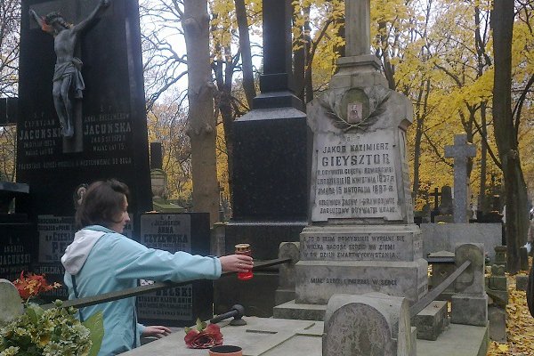 - Мы наведалі праваслаўныя могілкі на Волі, ушанавалі памяць нашых землякоў. На гэтых могілках нам вядомыя дзе знаходзяцца пахаванні Янкі Жамойціна, вядомыя могілкі прадзеда Паўла Севярынца і таксама мы ўшанавалі пахаванне Мітрапаліта Дзяніса, ён украінец па нацыянальнасці, але вельмі шмат зрабіў для беларусаў. Дзякуючы яму ў час Другой сусветнай вайны ў Варшаве быў беларускі прыход, была беларуская школа, было беларускае праваслаўнае жыццё. Цяпер мы знаходзімся на Павонзкіх могілках, наведалі магілу Марыі Ямант, нарачонай Кастуся Каліноўскага. Зараз наша невялікая грамада сабралася каля магілы Яна Булгака.
