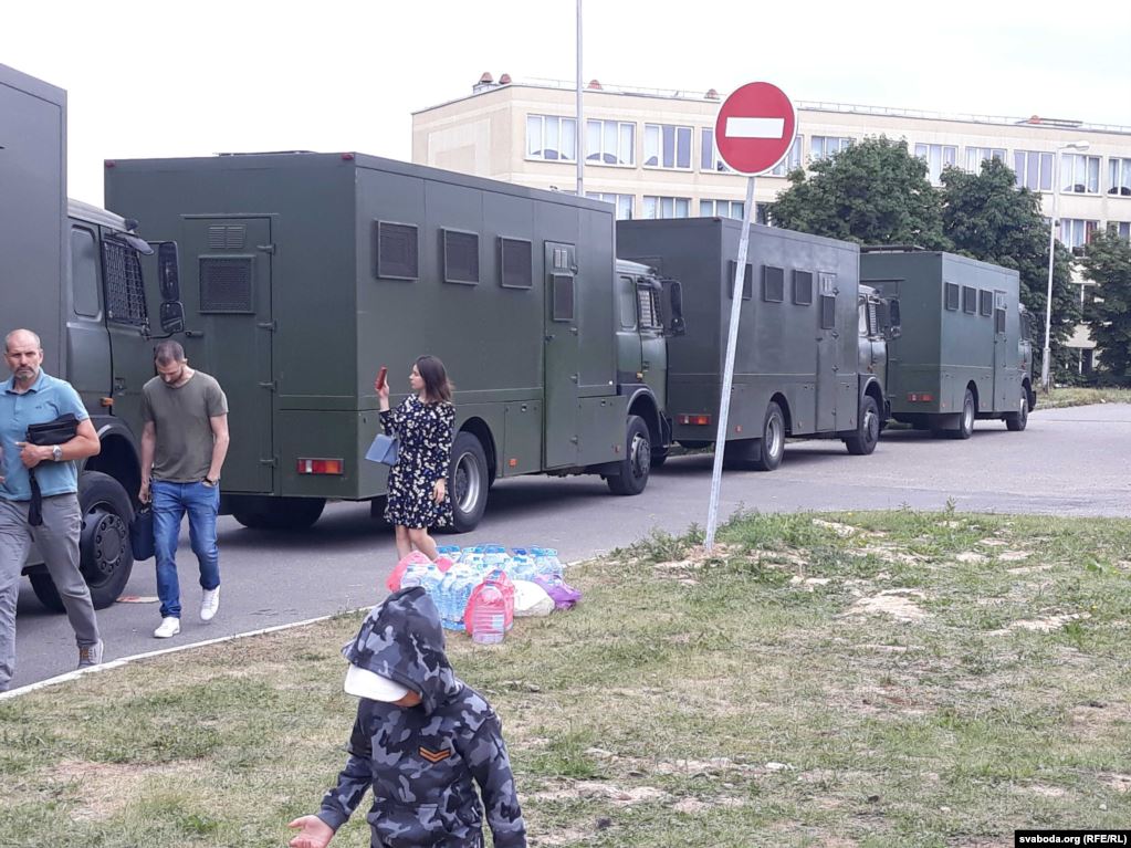 Перад будынкам стаіць каля 10 аўтазакаў. Па словах людзей, яшчэ 7