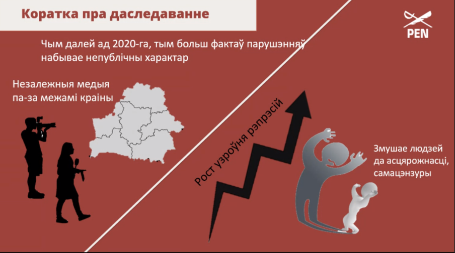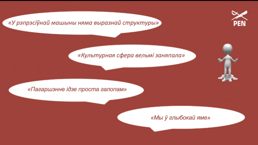 – Нашы рэспандэнты аднагалосна сцвярджаюць, што апошнія паўтара года сітуацыя ў сферы культуры толькі пагаршаецца, і гэта адбываецца праз звужэнне культурнай дзейнасці, планамерна знішчаюцца цэлыя пласты, якое-небудзь развіццё ў краіне адсутнічае. Закрываецца большасць культурных арганізацый, працягваецца прымусовая ліквідацыя, знішчаюцца альтэрнатыўныя адукацыйныя праекты, адбываецца ціск на сістэму прыватнай школы. Цэнзура – гэта самы папулярны від рэпрэсіяў, усё мусіць быць стэрыльным з гледзішча палітыка і крытычных выказванняў. Цяжка з пляцоўкамі, прасторамі, СМІ. Фактычна незалежная культура вярнулася да практыкі савецкага часу, у падполле.