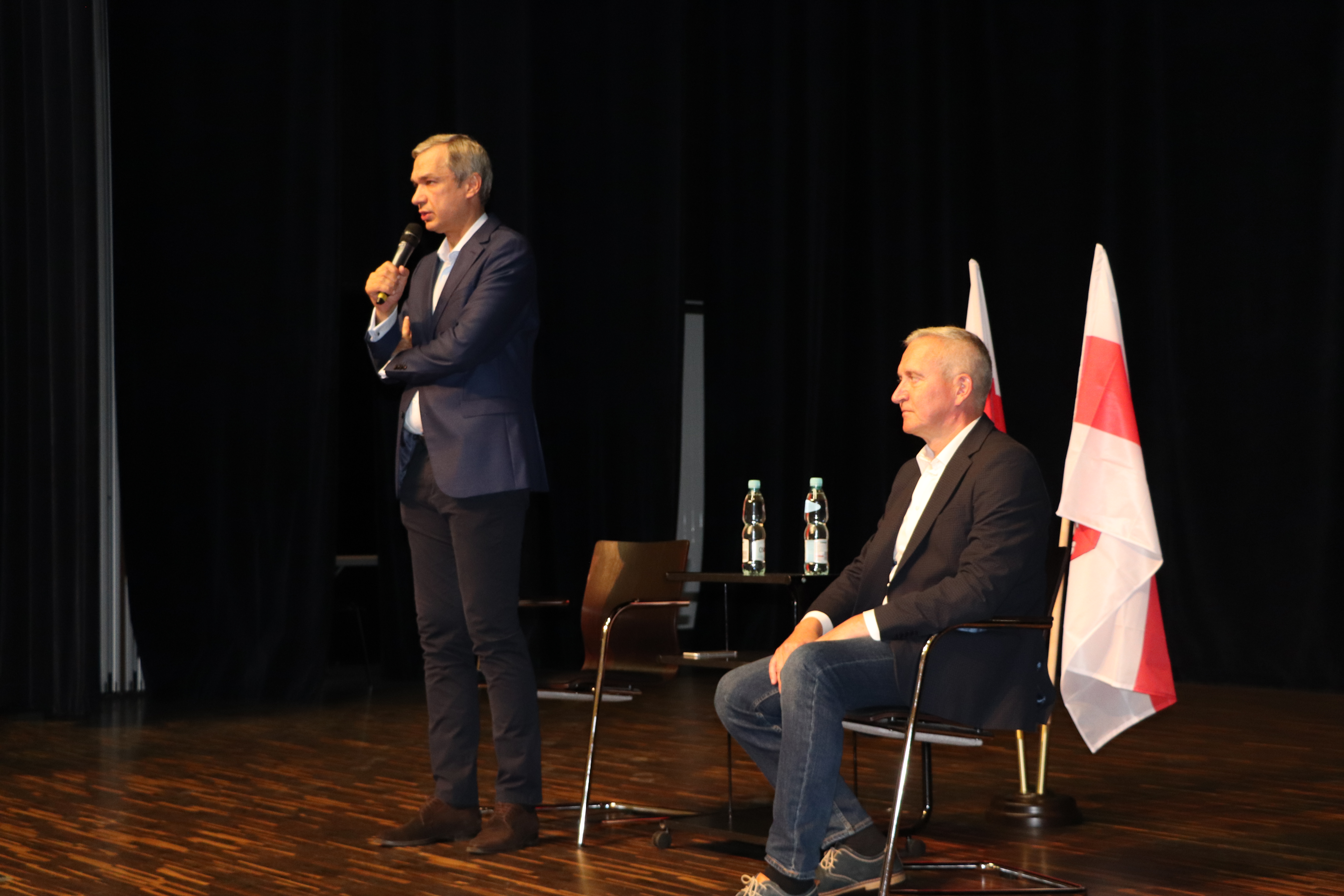 У Беластоку адбываецца сустрэча з Паўлам Латушкам. На адкрытую сустрэчу прыйшлі дзясяткі людзей з бел-чырвона-белымі сцягамі.