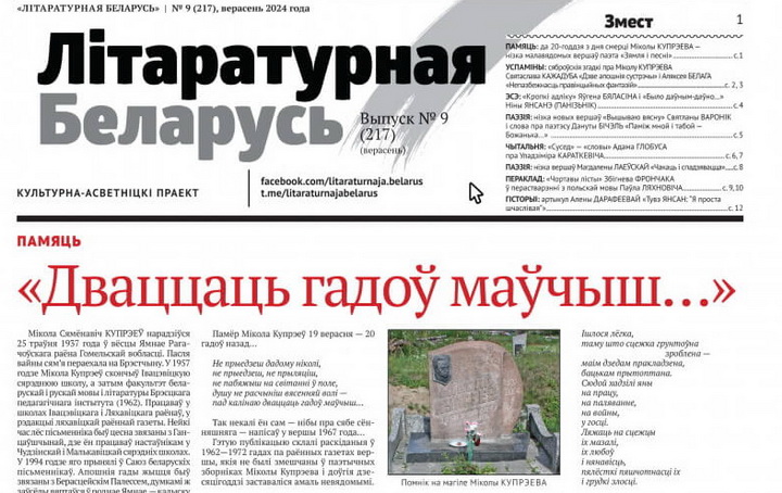 Выйшаў вераснёўскі нумар “Літаратурнай Беларусі”, які часткова прысвечаны памяці паэта і празаіка Міколы Купрэева. Таксама чытачы знойдуць у выпуску традыцыйныя рубрыкі: “Чытальня”, “Паэзія”, “Пераклады” і г.д.