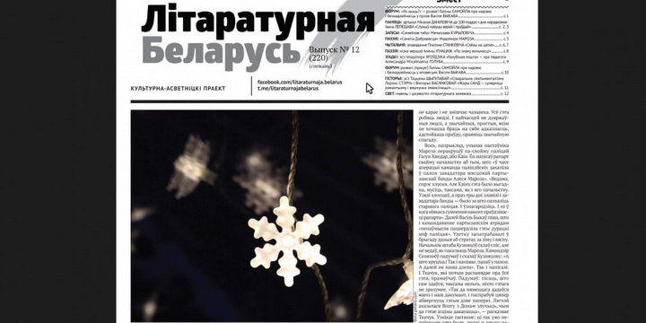 Выйшаў снежаньскі нумар штомесячніка “Літаратурная Беларусь”. У выпуску чытачы знойдуць матэрыялы пра Васіля Быкава, новае апавяданне лаўрэата конкурсу да 100-годдзя Быкава — Платона Станкевіча, вершы Алены Ігнацюк і Уладзіміра Мароза, эсэ пра Жорж Санд і многае іншае.