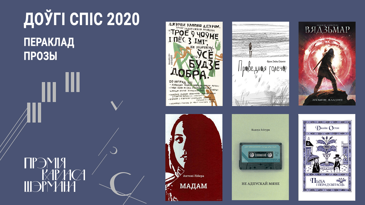 Доўгі спіс прэміі Карласа Шэрмана 2020Павел Касцюкевіч, пераклад з англійскай – Джэром Клапка Джэром “Трое ў чоўне і пёс з імі”. Выдавецтва “Логвінаў”, Вільня.
