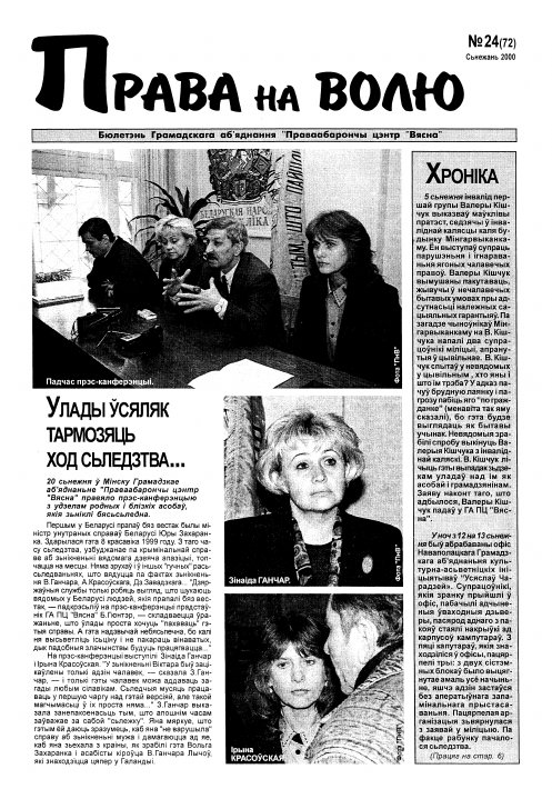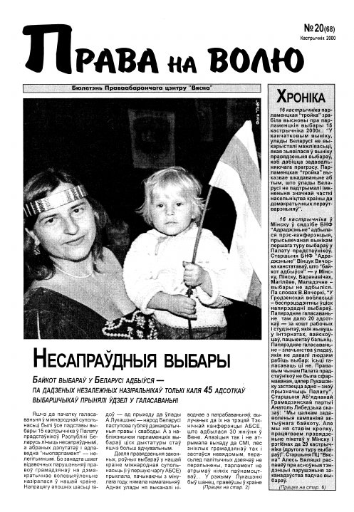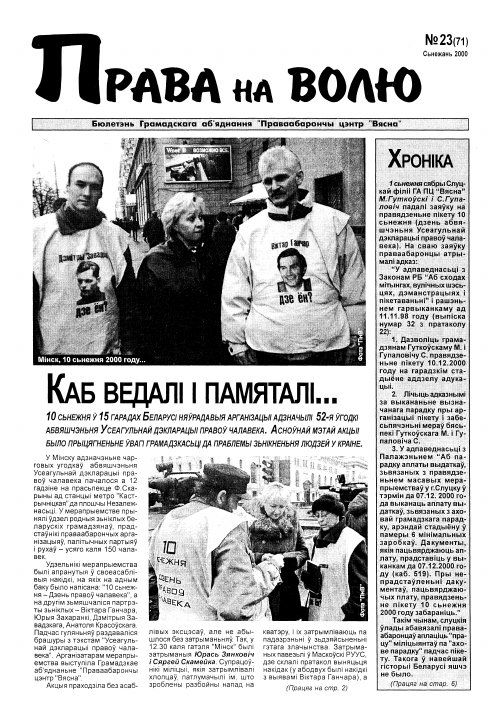 Праваабарончы цэнтр «Вясна» - няўрадавая праваабарончая арганізацыя, створаная ў красавіку 1996 году падчас масавых акцыяў пратэсту дэмакратычнай апазіцыі ў Беларусі, якая пасьля арыштаў удзельнікаў дэманстрацыяў займалася дапамогай арыштаваным і іх сем’ям. Таму першапачаткова арганізацыя мела назву “Вясна-96”. 15 чэрвеня 1999 году арганізацыя была зарэгістраваная як Грамадзкае аб’яднаньне “Праваабарончы цэнтр “Вясна”. Уяўляе сабой рэсп... Болей »