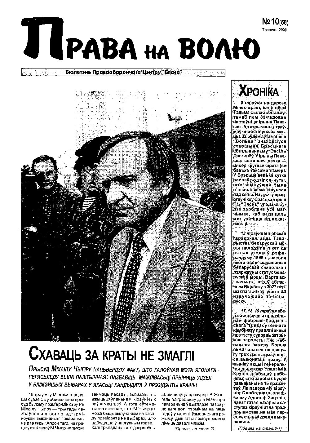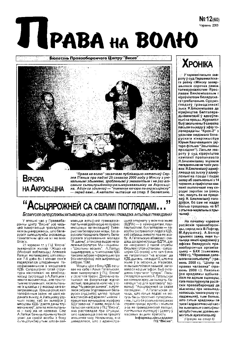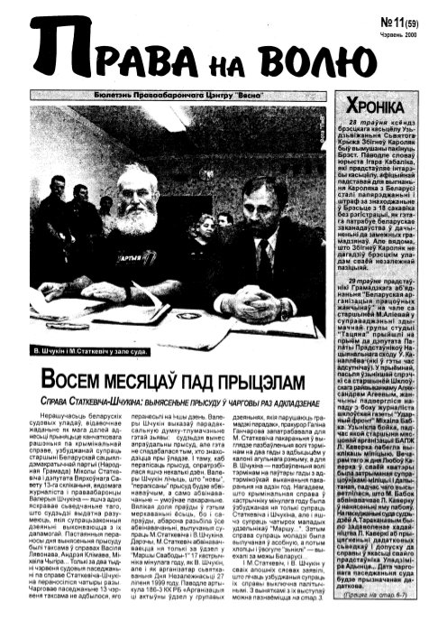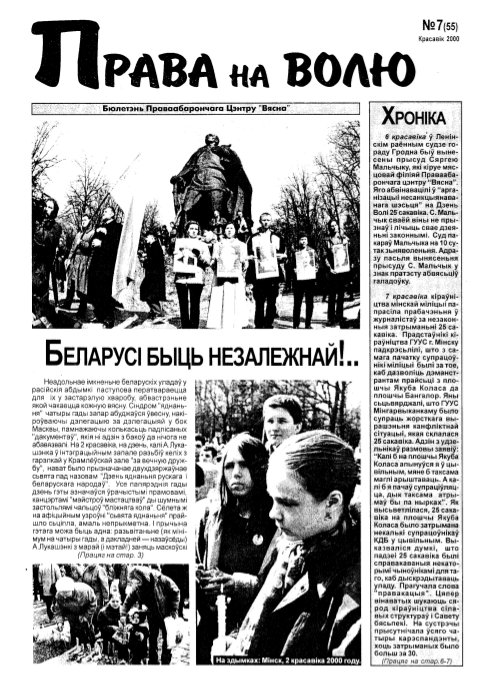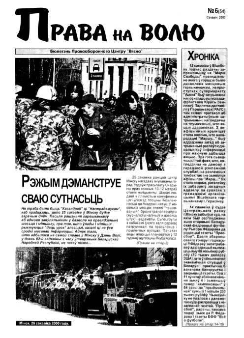 Праваабарончы цэнтр «Вясна» - няўрадавая праваабарончая арганізацыя, створаная ў красавіку 1996 году падчас масавых акцыяў пратэсту дэмакратычнай апазіцыі ў Беларусі, якая пасьля арыштаў удзельнікаў дэманстрацыяў займалася дапамогай арыштаваным і іх сем’ям. Таму першапачаткова арганізацыя мела назву “Вясна-96”. 15 чэрвеня 1999 году арганізацыя была зарэгістраваная як Грамадзкае аб’яднаньне “Праваабарончы цэнтр “Вясна”. Уяўляе сабой рэсп... Болей »