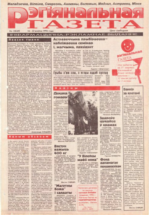 “Рэгіянальная газета” – недзяржаўнае выданне, якое не з’яўляецца выразнікам інтарэсаў і пазіцый якой-небудзь палітычнай партыі, рэлігійнай канфесіі, органаў улады. У сваіх публікацыях па пытаннях эканомікі, палітыкі, культуры, гісторыі, рэлігіі рэдакцыя захоўвае незалежную непрадузятасць і павагу да праўды, у роўнай ступені паказвае супрацьлеглыя пункты гледжання, пазбягаючы тэндэнцыйнасці. Выданне разлічанае на масавага чытача рознага ... Болей »