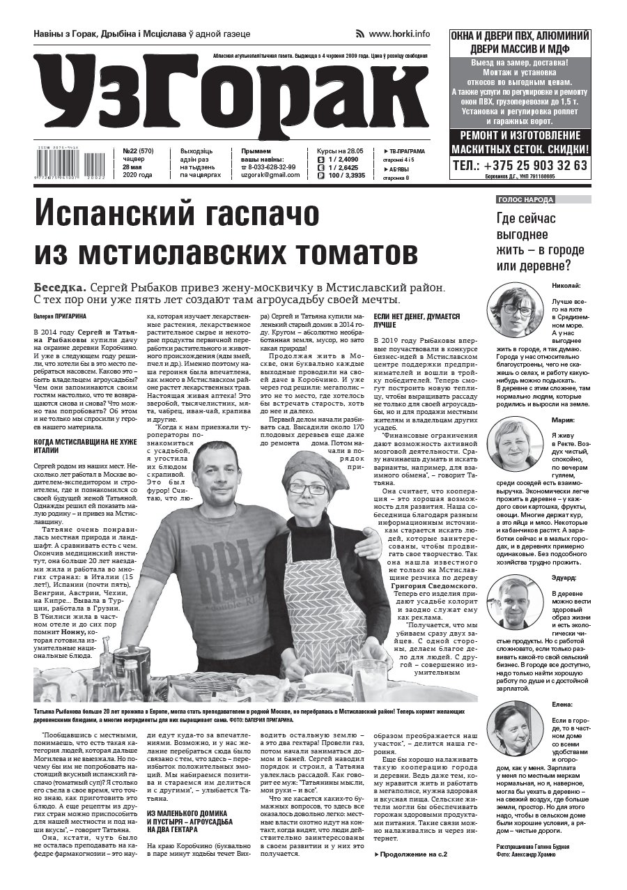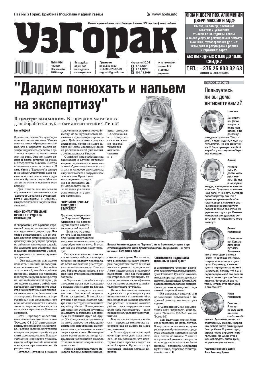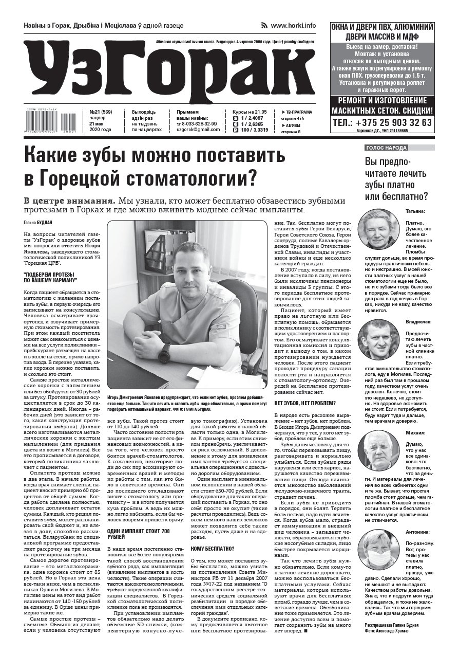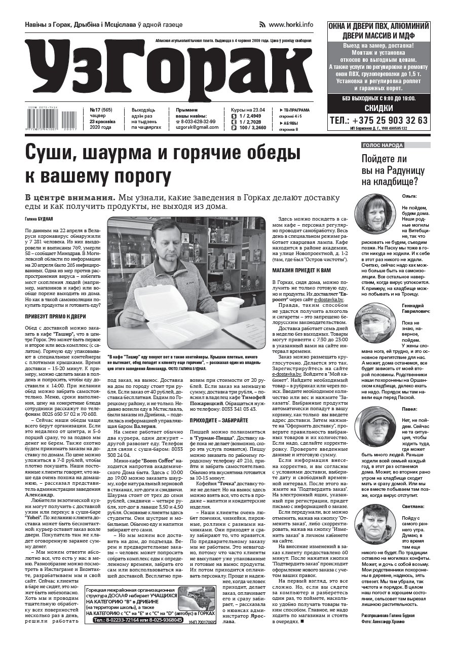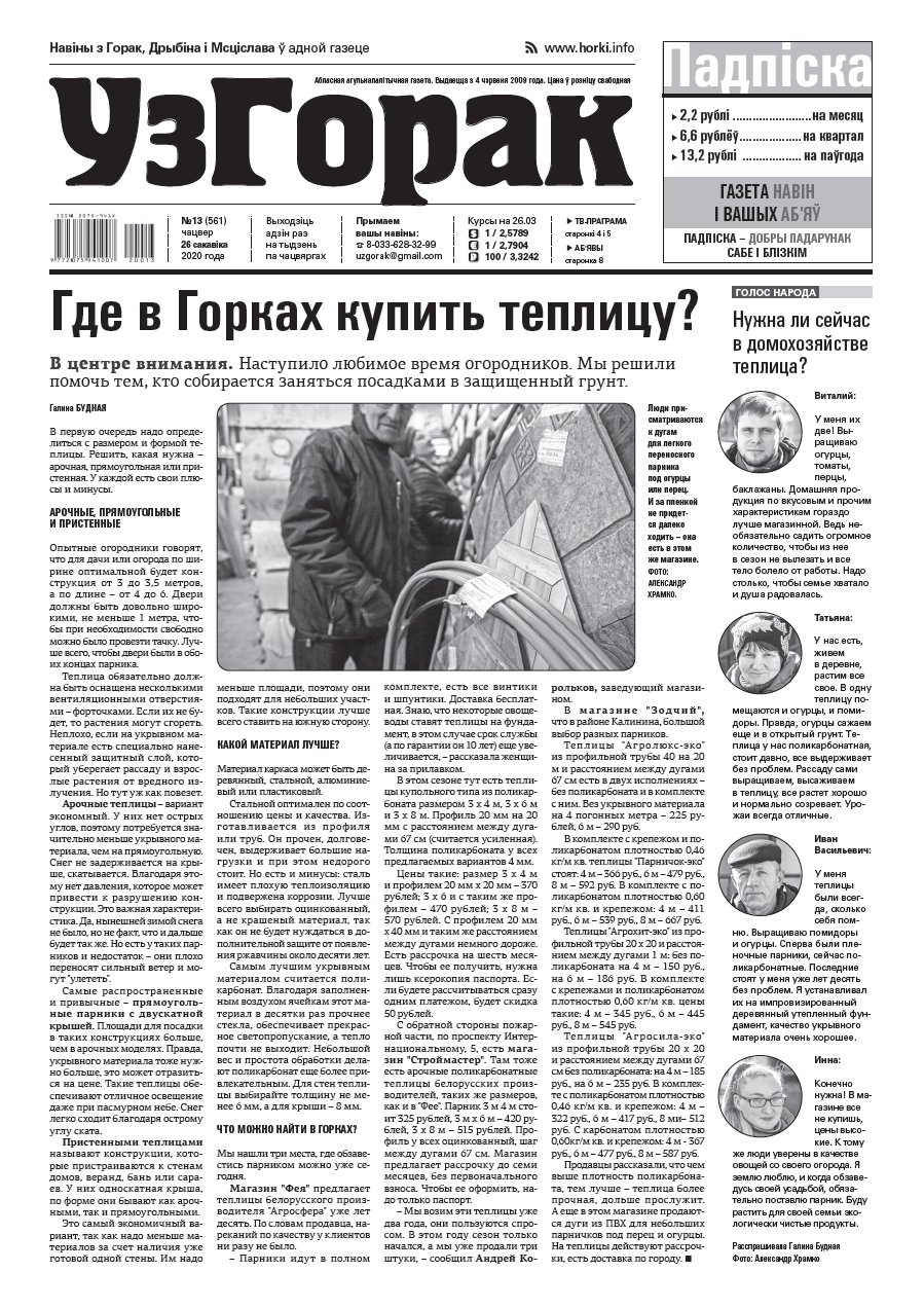 Абласная газета "УзГорак" выходзіць і прадаецца ў Горацкім, Дрыбінскім і Мсціслаўскім раёнах па чацвяргах. Наклад – 2100 асобнікаў на тыдзень. Актуальныя для мясцовых жыхароў тэмы, штотыднёвыя апытанні гараджан, фотарэпартажы, праграма любімых тэлеканалаў, сканворды, прыватныя аб'явы, астрапрагноз і віншаванні. Болей »
