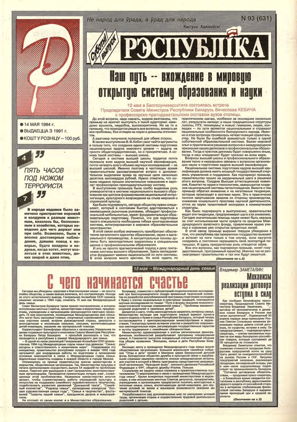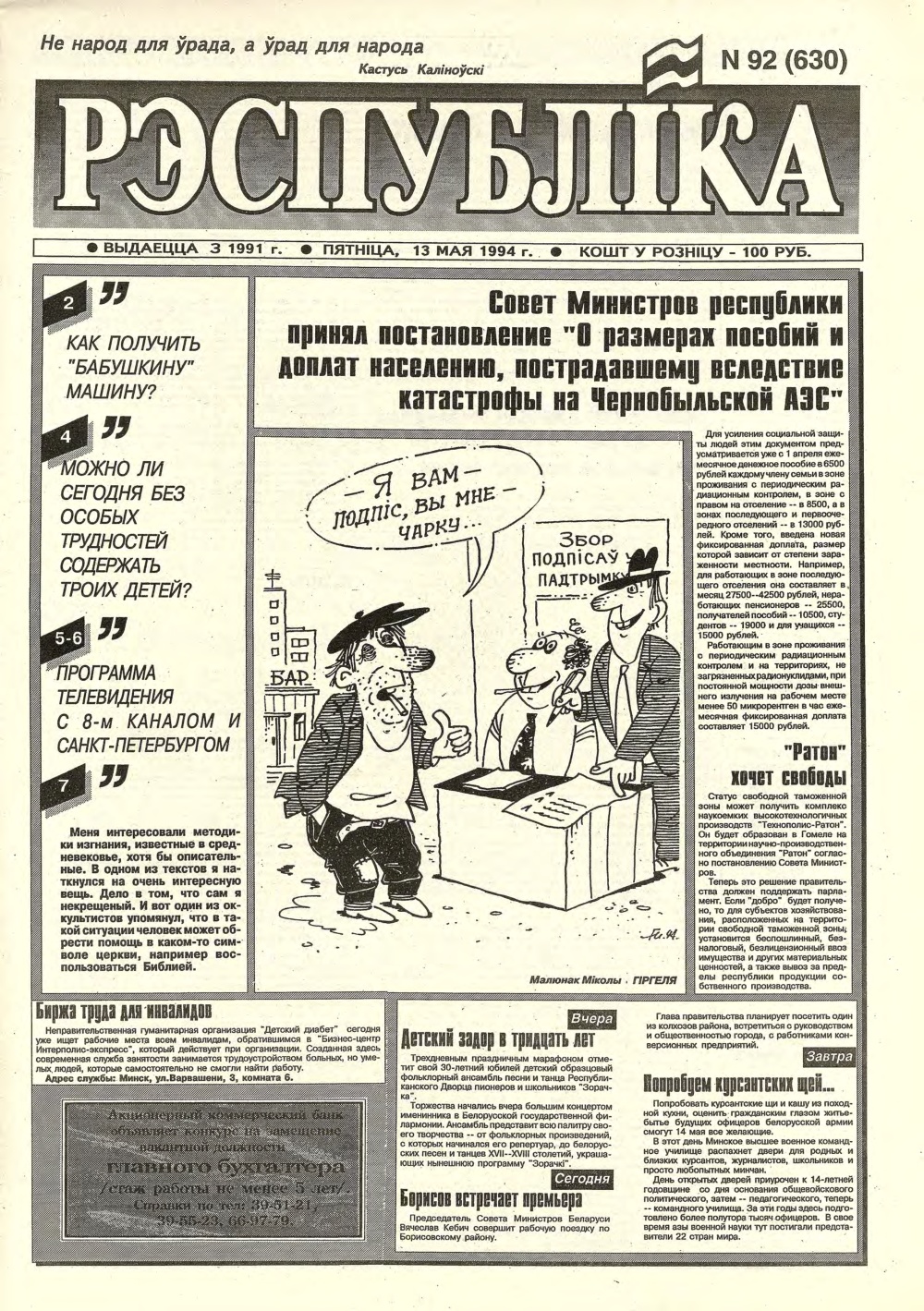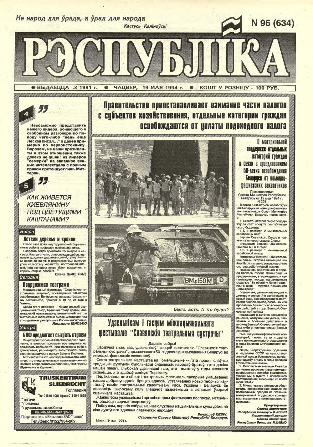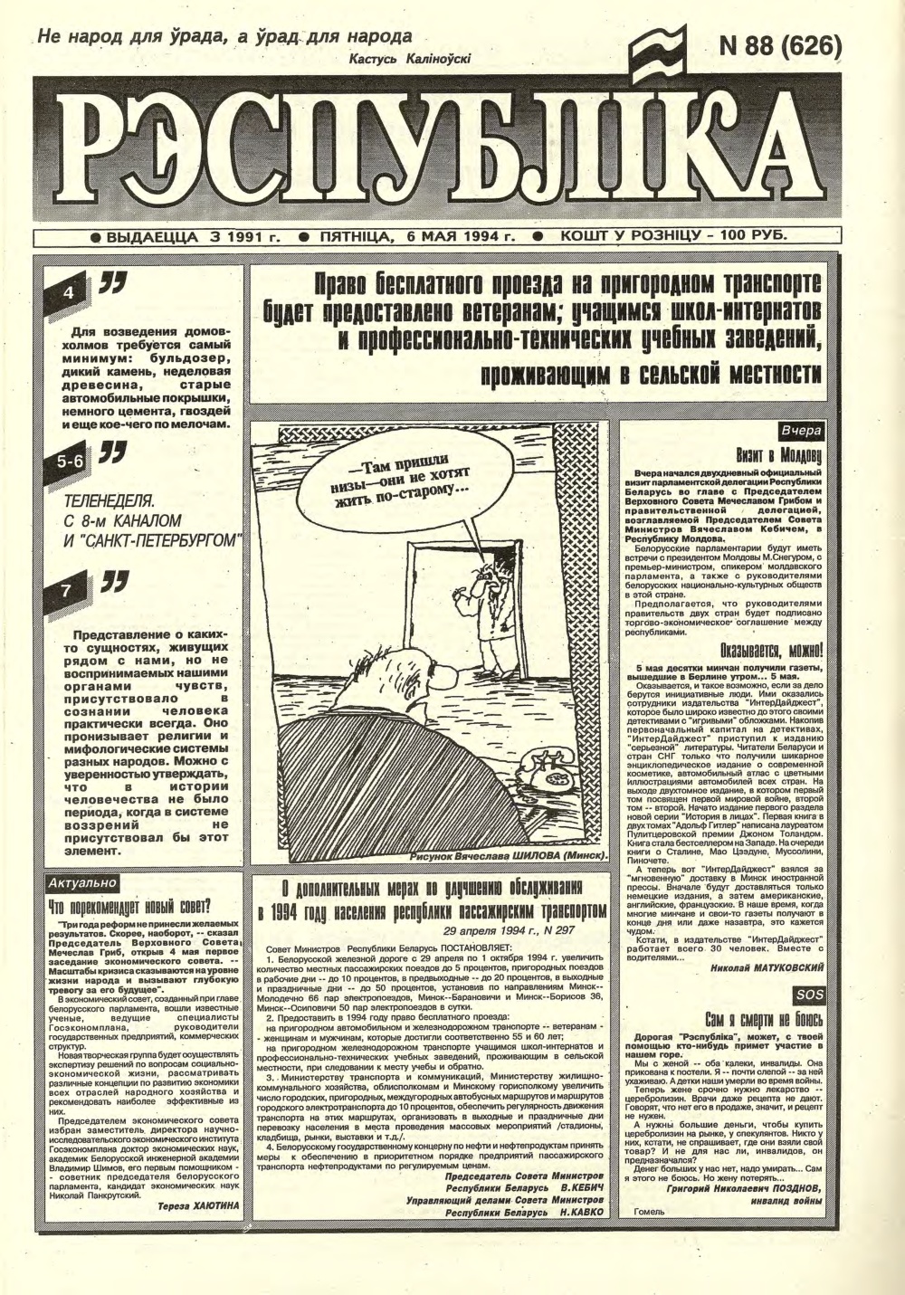 «Рэспубліка» — газета для тых, хто самастойна прымае рашэнні. Заснавальнік - Савет Міністраў Рэспублікі Беларусь. Выдаецца з чэрвеня 1991. Газета выходзіць 250 разоў у год. Аўтары апублікаваных матэрыялаў нясуць адказнасць за падбор і дакладнасць фактаў, іх меркаванні неабавязкова адлюстроўваюць пункт гледжання рэдакцыі. Рукапісы, фотаздымкі і малюнкі не рэцэнзуюцца I не вяртаюцца. Болей »