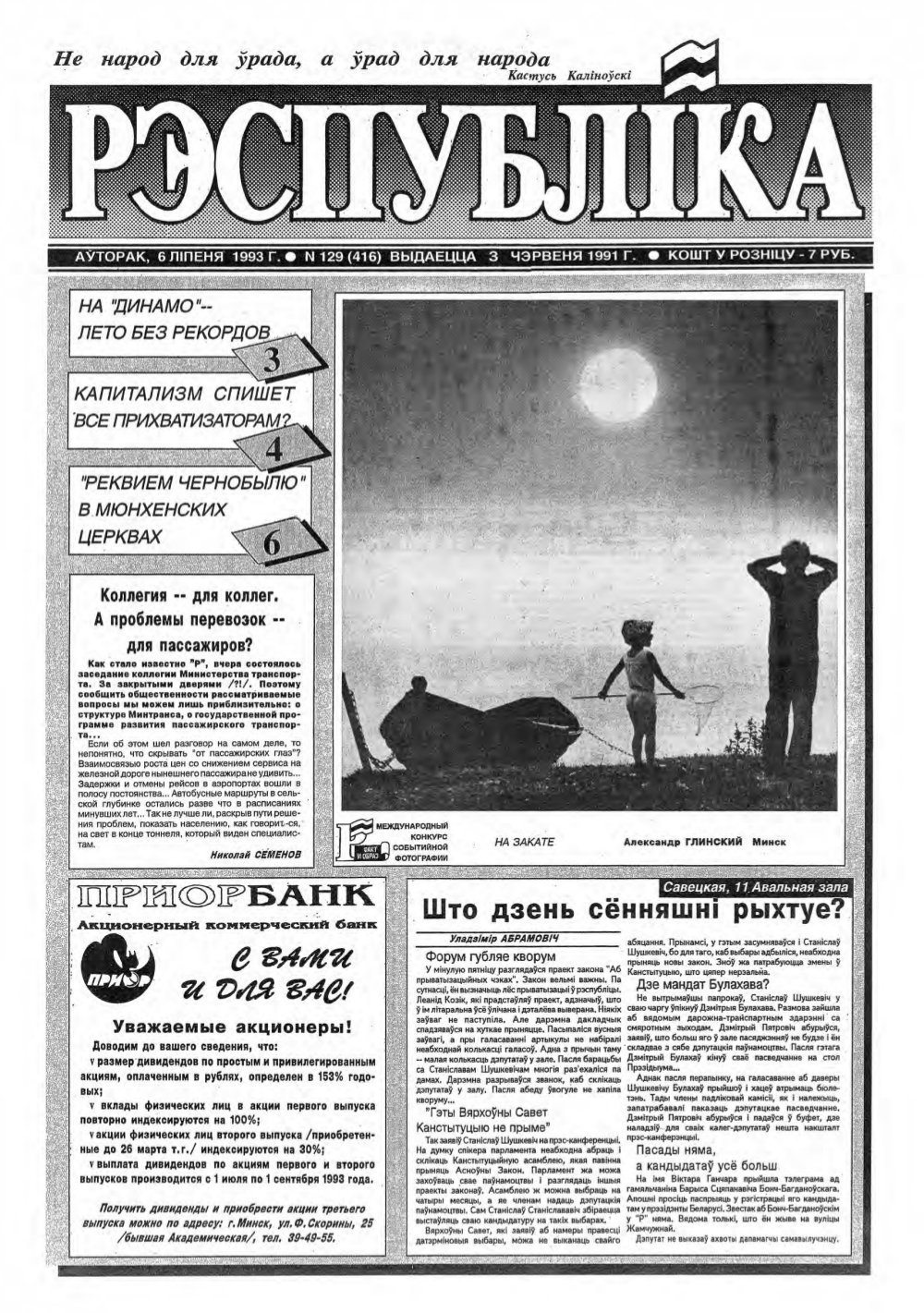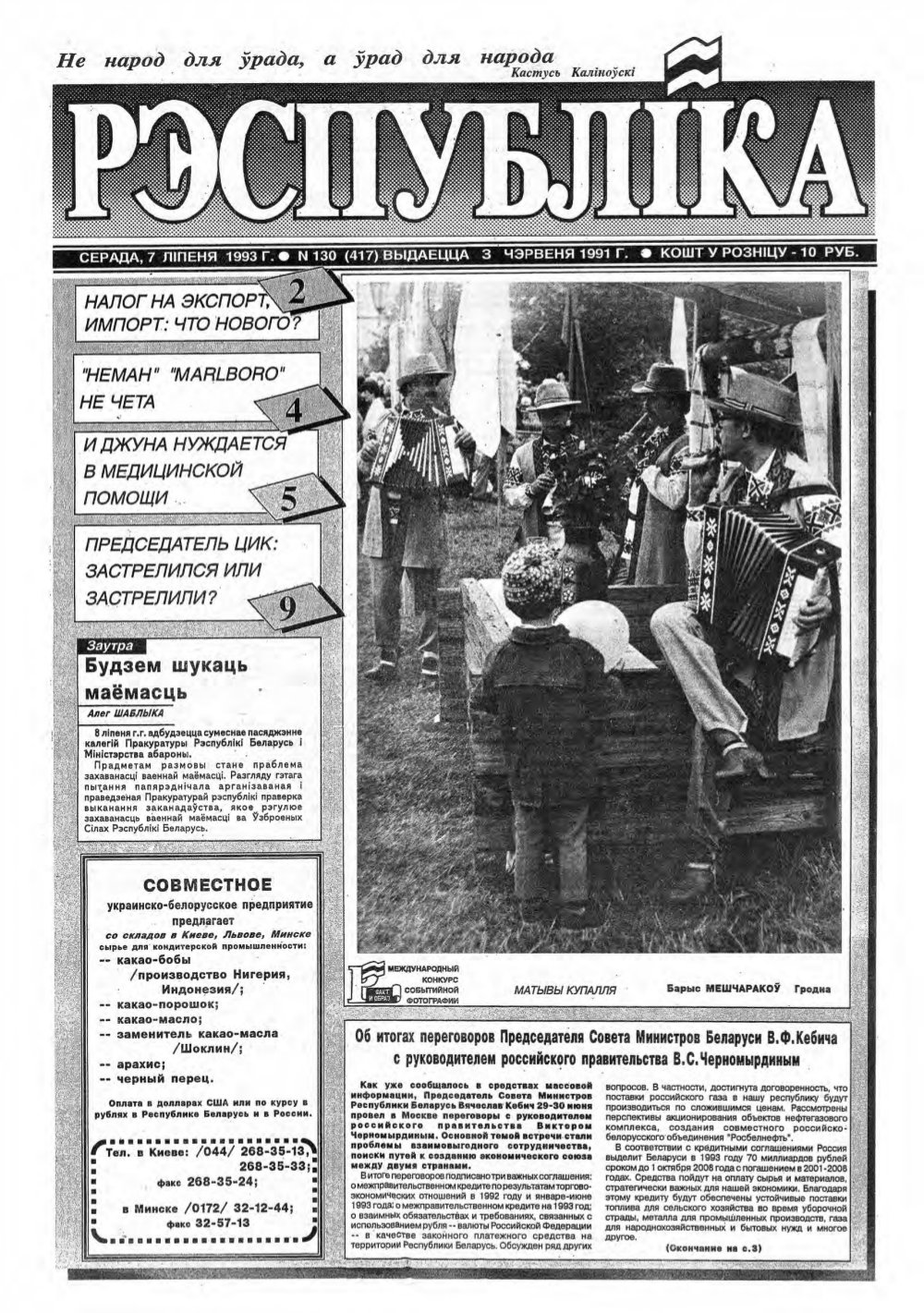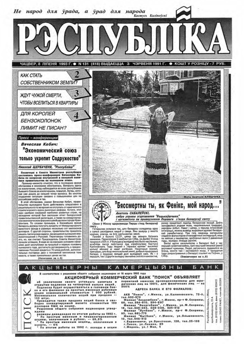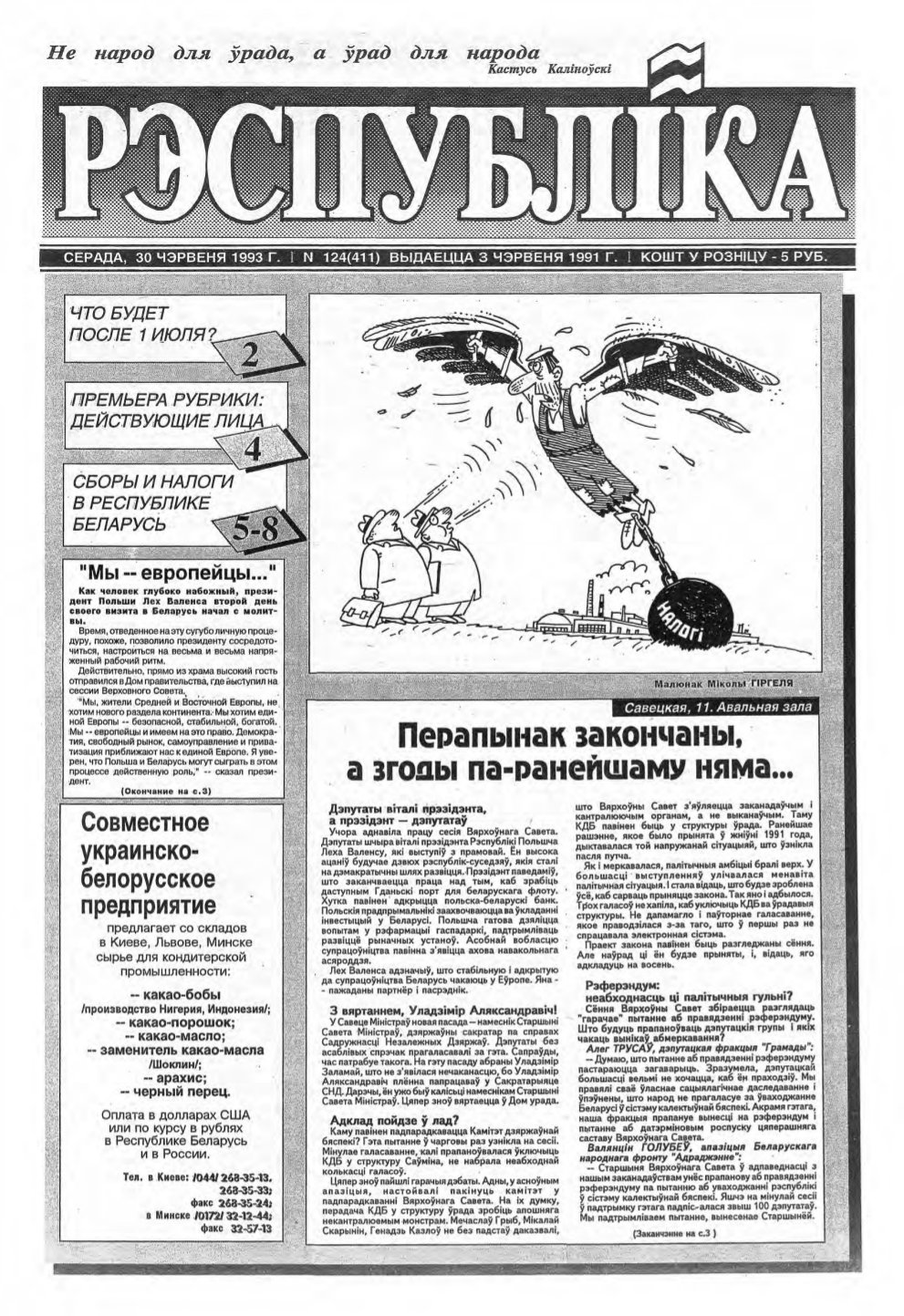 «Рэспубліка» — газета для тых, хто самастойна прымае рашэнні. Заснавальнік - Савет Міністраў Рэспублікі Беларусь. Выдаецца з чэрвеня 1991. Газета выходзіць 250 разоў у год. Аўтары апублікаваных матэрыялаў нясуць адказнасць за падбор і дакладнасць фактаў, іх меркаванні неабавязкова адлюстроўваюць пункт гледжання рэдакцыі. Рукапісы, фотаздымкі і малюнкі не рэцэнзуюцца I не вяртаюцца. Болей »