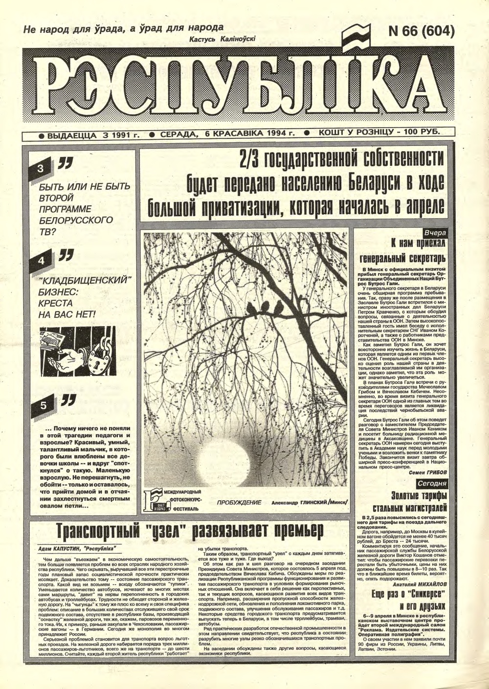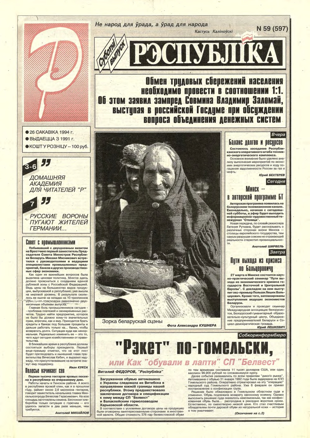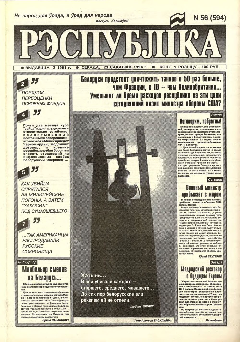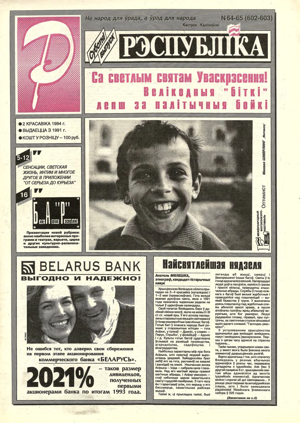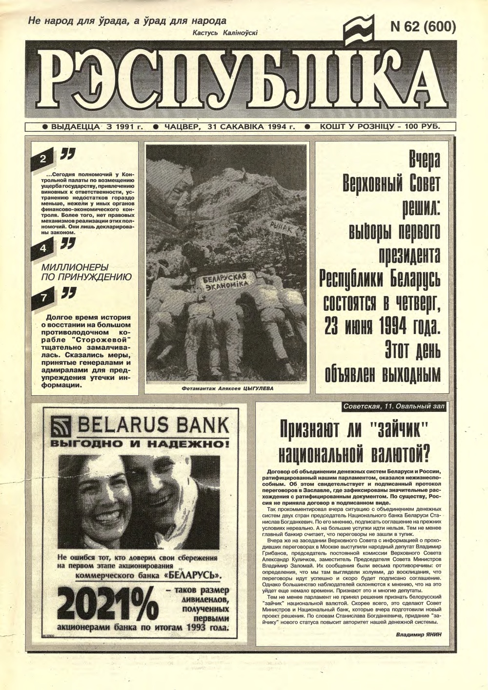 «Рэспубліка» — газета для тых, хто самастойна прымае рашэнні. Заснавальнік - Савет Міністраў Рэспублікі Беларусь. Выдаецца з чэрвеня 1991. Газета выходзіць 250 разоў у год. Аўтары апублікаваных матэрыялаў нясуць адказнасць за падбор і дакладнасць фактаў, іх меркаванні неабавязкова адлюстроўваюць пункт гледжання рэдакцыі. Рукапісы, фотаздымкі і малюнкі не рэцэнзуюцца I не вяртаюцца. Болей »