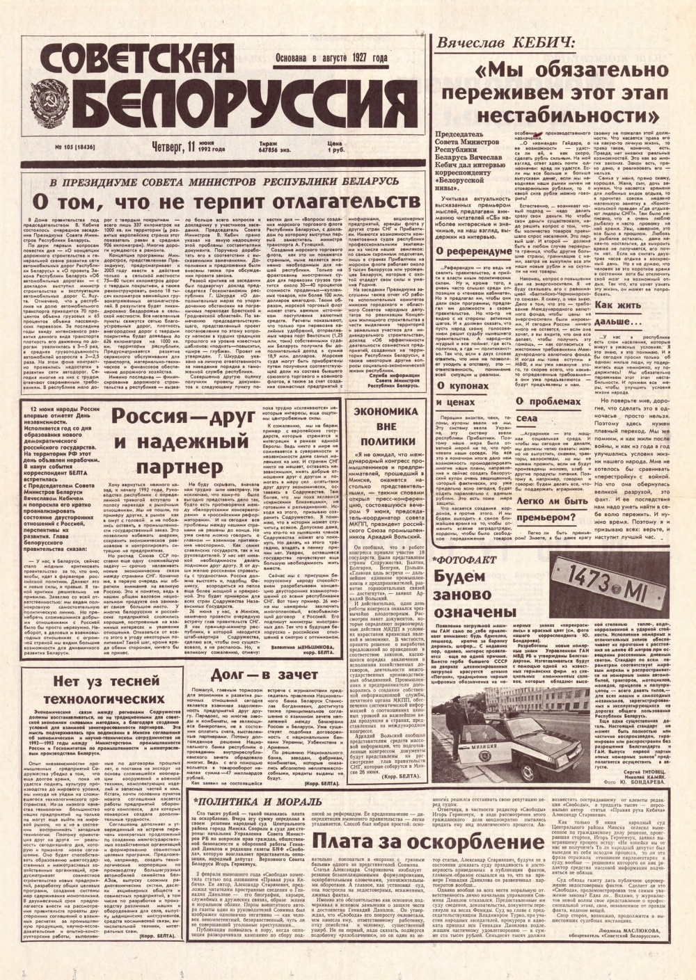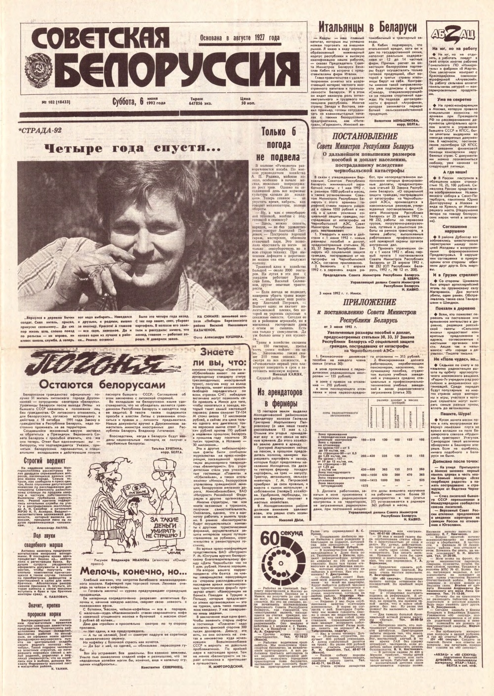 «Советская Белоруссия» — орган Центрального Комитета Коммунистической партии Белоруссии, Верховного Совета и Совета Министров БССР. Белорусская общественно-политическая газета. Издаётся с августа 1927 года. Выходит 5 раз в неделю. Учредители — Администрация президента Республики Беларусь и редакционный совет. На апрель 2019 года тираж — 190 тыс. экземпляров. Крупнейшее печатное СМИ страны. При этом во многих СМИ неоднократно сообщалось ... Болей »