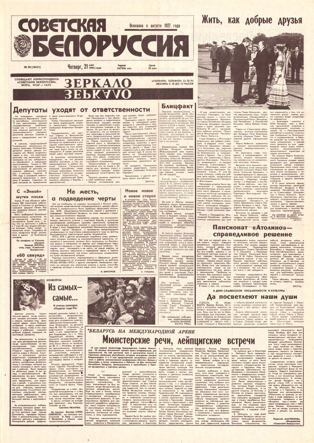 «Советская Белоруссия» — орган Центрального Комитета Коммунистической партии Белоруссии, Верховного Совета и Совета Министров БССР. Белорусская общественно-политическая газета. Издаётся с августа 1927 года. Выходит 5 раз в неделю. Учредители — Администрация президента Республики Беларусь и редакционный совет. На апрель 2019 года тираж — 190 тыс. экземпляров. Крупнейшее печатное СМИ страны. При этом во многих СМИ неоднократно сообщалось ... Болей »