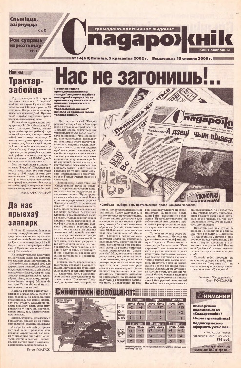 «Спадарожнікс» — грамадска-палітычнае выданне. Рукапісы і здымкі не рэцэнзуюцца і не вяртаюцца. Адказнасць за дакладнасць друкуемых фактаў і падзей нясуць аўтары. Выказаныя ў дасланых матэрыялах думкі могуць не супадаць з пунктам гледжання рэдакцыі газеты і не накладаюць на яе ніякіх абавязкаў. Адказнасць за змест рэкламы нясуць рэкламадаўцы. Болей »