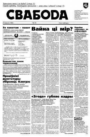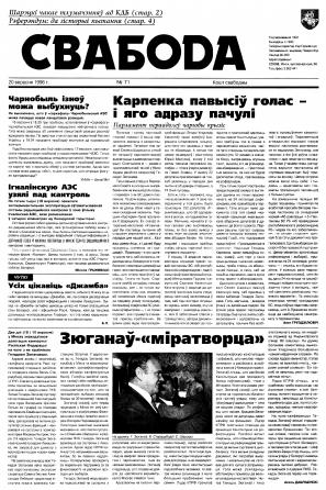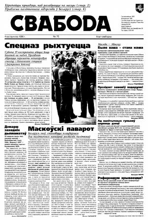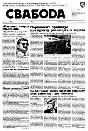 Свабода - самая масавая незалежная газэта ў Беларусі 1990-х гадоў. Выдавалася з 25 сакавіка 1990 па 1997 ў Менску. Газэта асьвятляла пытаньні грамадзка-палітычнага, эканамічнага, культурнага і духоўнага жыцьця Беларусі, знаёміла чытачоў з міжнароднымі падзеямі, друкавала матэрыялы па гісторыі Беларусі. Рэдакцыя выданьня стаяла на нацыянальна-дэмакратычных пазыцыях, крытычна адносілася да дзеючых на Беларусі органаў улады. Рэдакцыя лічыл... Болей »