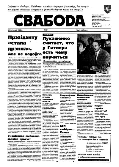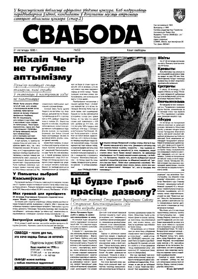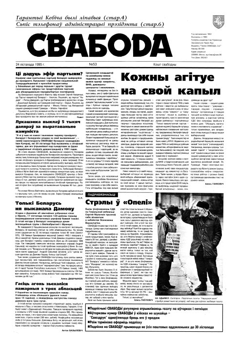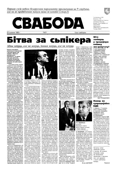 Свабода - самая масавая незалежная газэта ў Беларусі 1990-х гадоў. Выдавалася з 25 сакавіка 1990 па 1997 ў Менску. Газэта асьвятляла пытаньні грамадзка-палітычнага, эканамічнага, культурнага і духоўнага жыцьця Беларусі, знаёміла чытачоў з міжнароднымі падзеямі, друкавала матэрыялы па гісторыі Беларусі. Рэдакцыя выданьня стаяла на нацыянальна-дэмакратычных пазыцыях, крытычна адносілася да дзеючых на Беларусі органаў улады. Рэдакцыя лічыл... Болей »