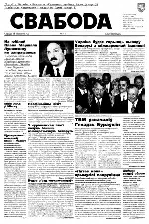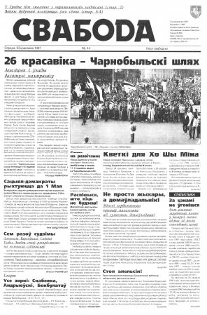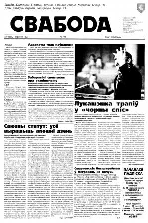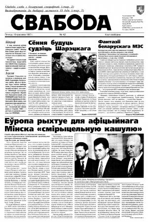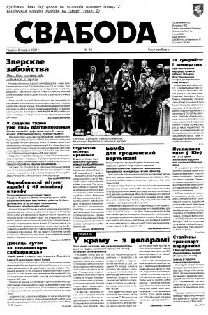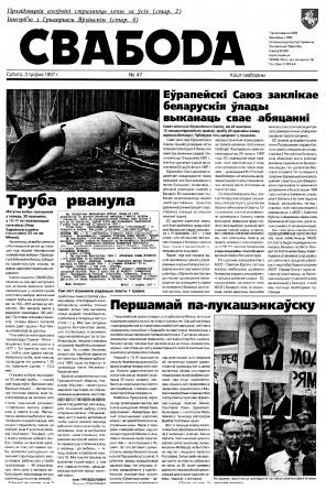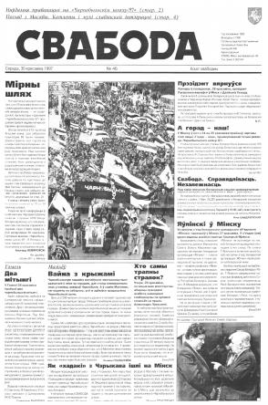 Свабода - самая масавая незалежная газэта ў Беларусі 1990-х гадоў. Выдавалася з 25 сакавіка 1990 па 1997 ў Менску. Газэта асьвятляла пытаньні грамадзка-палітычнага, эканамічнага, культурнага і духоўнага жыцьця Беларусі, знаёміла чытачоў з міжнароднымі падзеямі, друкавала матэрыялы па гісторыі Беларусі. Рэдакцыя выданьня стаяла на нацыянальна-дэмакратычных пазыцыях, крытычна адносілася да дзеючых на Беларусі органаў улады. Рэдакцыя лічыл... Болей »