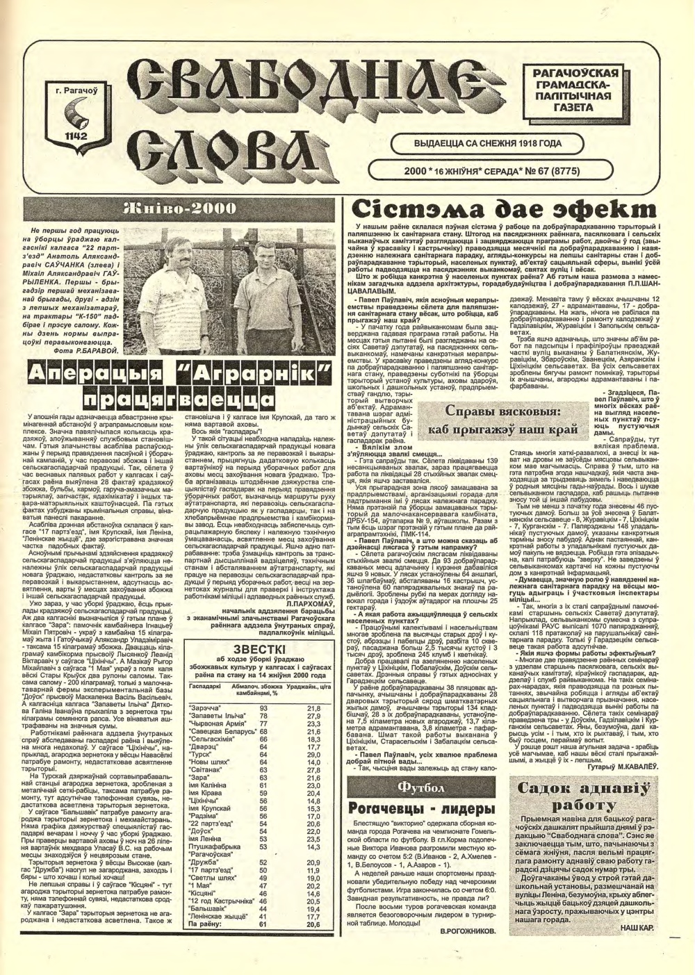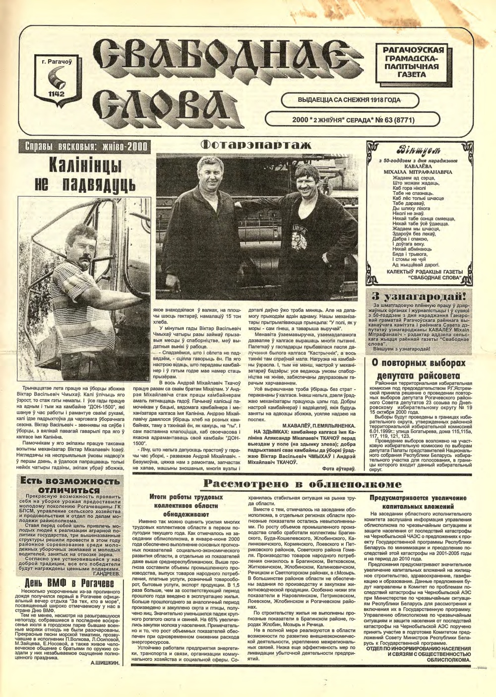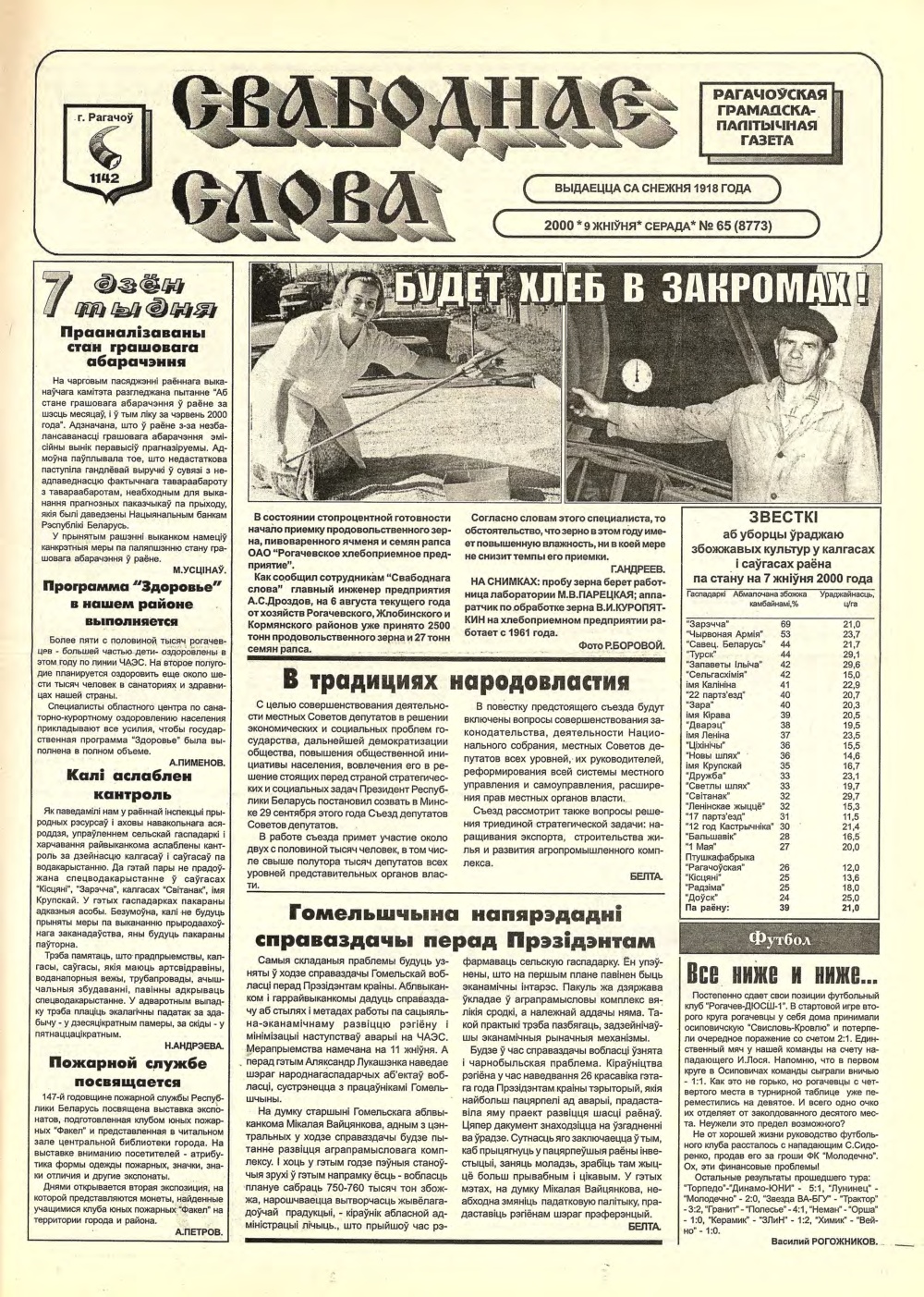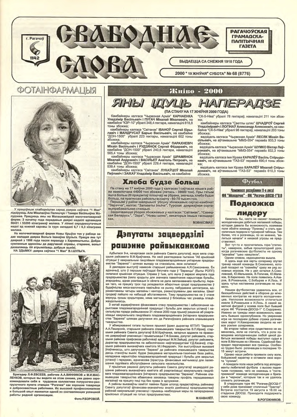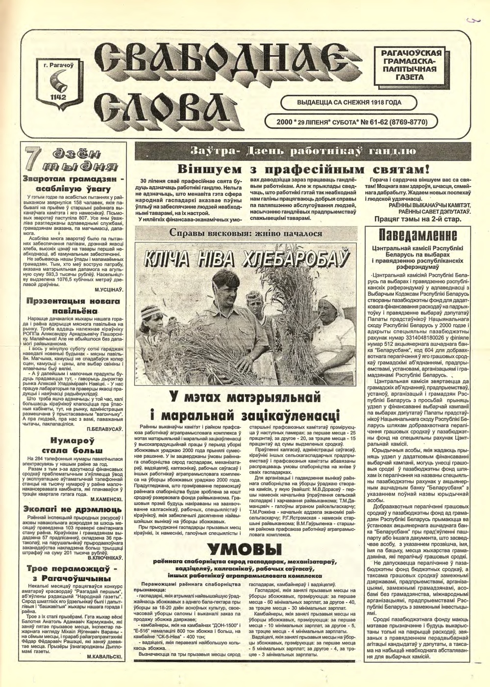 «Свабоднае слова» — Рагачоўская грамадска-палітычная газета. Выдаецца са снежня 1918 года. Аўтары апублікаваных матэрыялаў нясуць адказнасць за падбор і дакладнасць фактаў. Іх меркаванні не заўсёды супадаюць з меркаваннем рэдакцыі. Рэдакцыя пакідае за сабой права не ўступаць у перапіску з чытачамі. Болей »