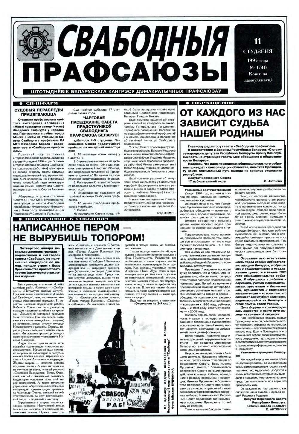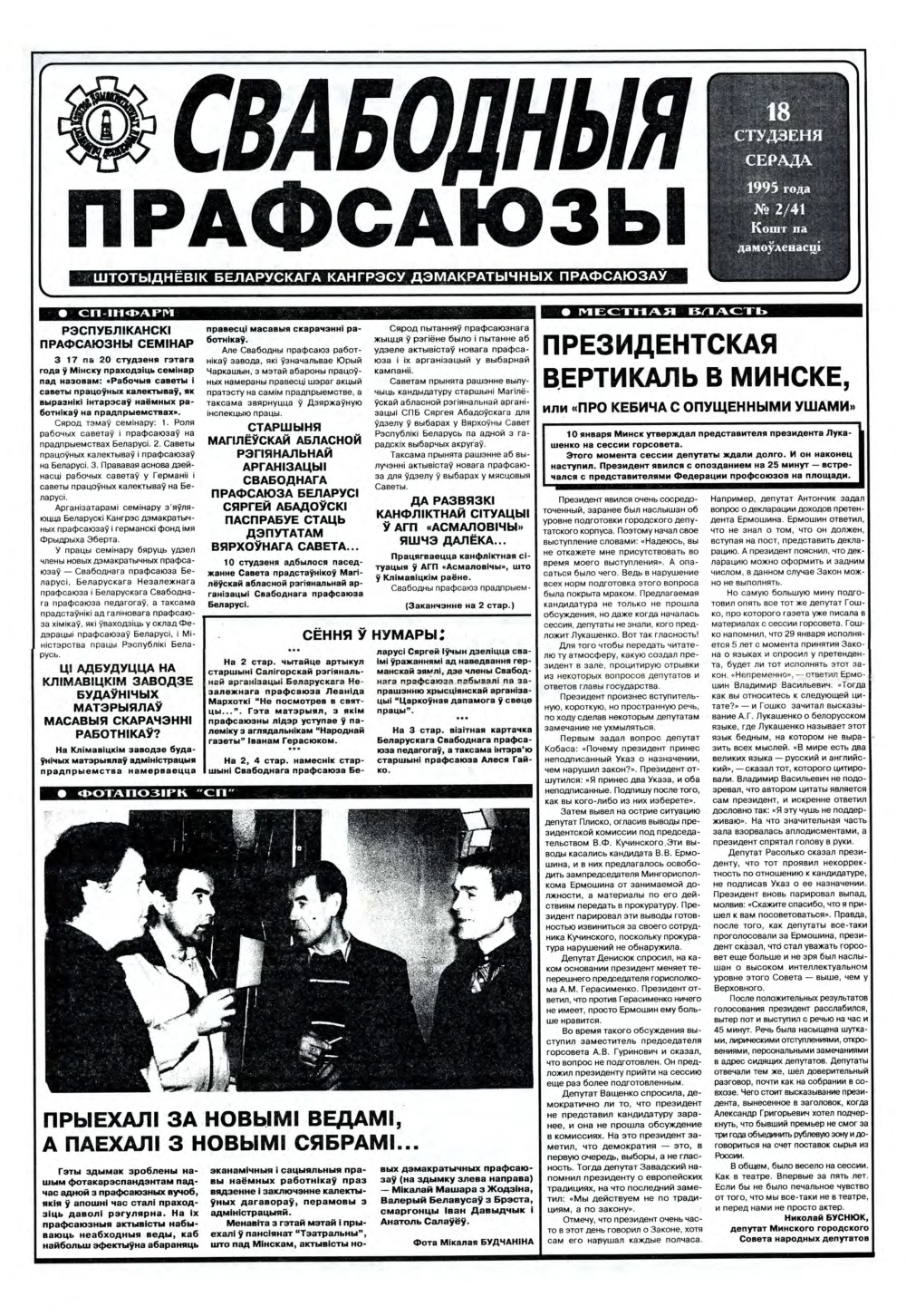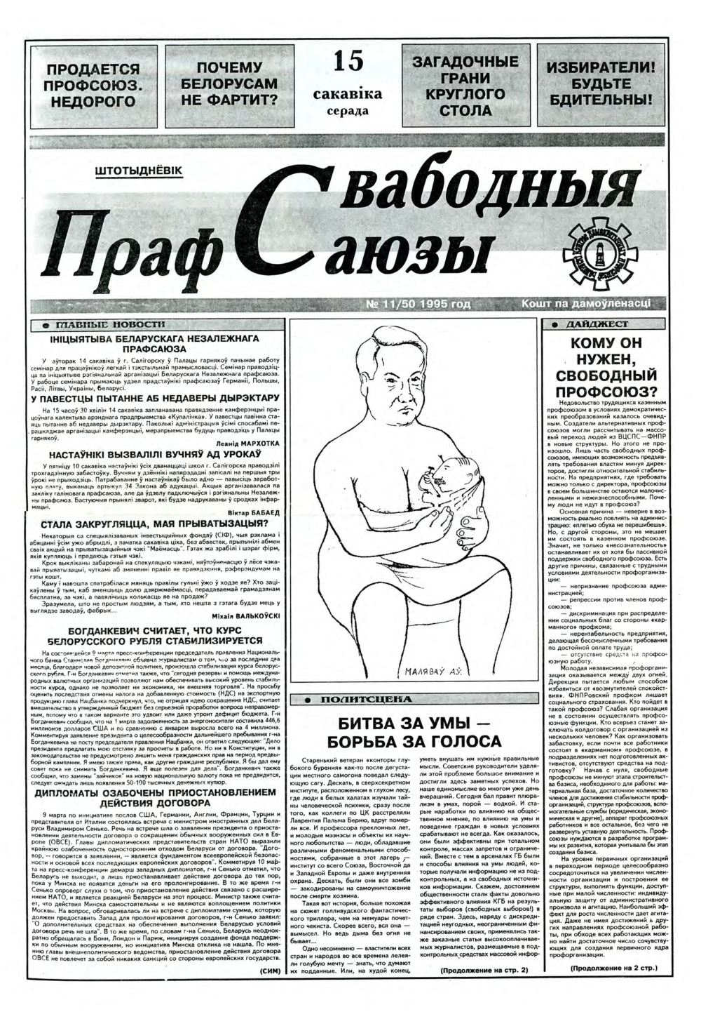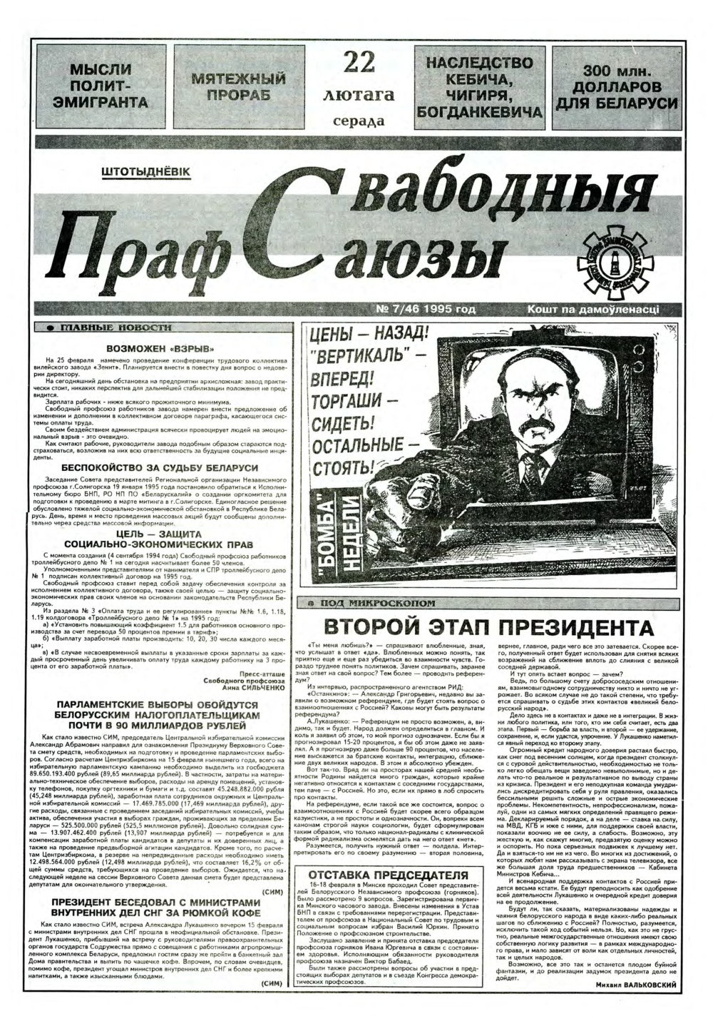 «Свабодныя прафсаюзы» — выдаецца з лістапада 1993 года на беларускай і рускай мовах. Заснавзльнікі: Беларускі кангрэс дэмакратычных прафсаюзаў. Рукапісы не рэцэнзуюцца і не вяртаюцца. Рэдакцыя можа друкаваць артыкулы ў парадку абмеркавання, не падзяляючы пункту гледжання аўтара. Болей »