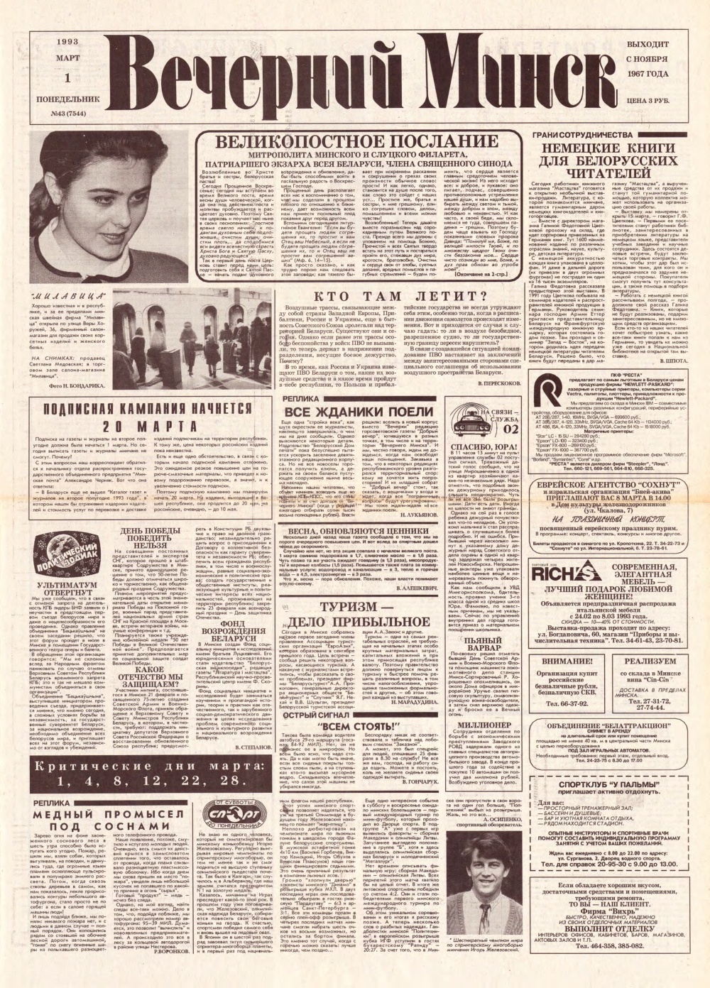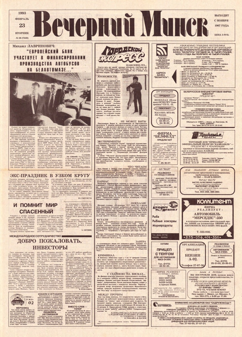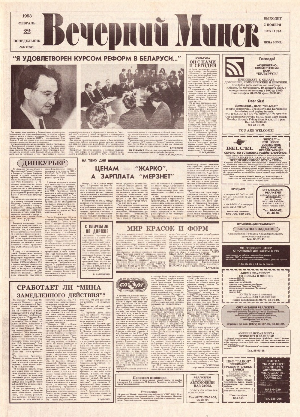«Вечерний Минск» — выходит з ноября 1967 года. Учредитель: трудовой коллектив редакции газеты «Вечерний Минск». Газета издается на русском и белорусском языках, выходит 5 раз в неделю, кроме субботы и воскресенья — 250 раз в году. Болей »