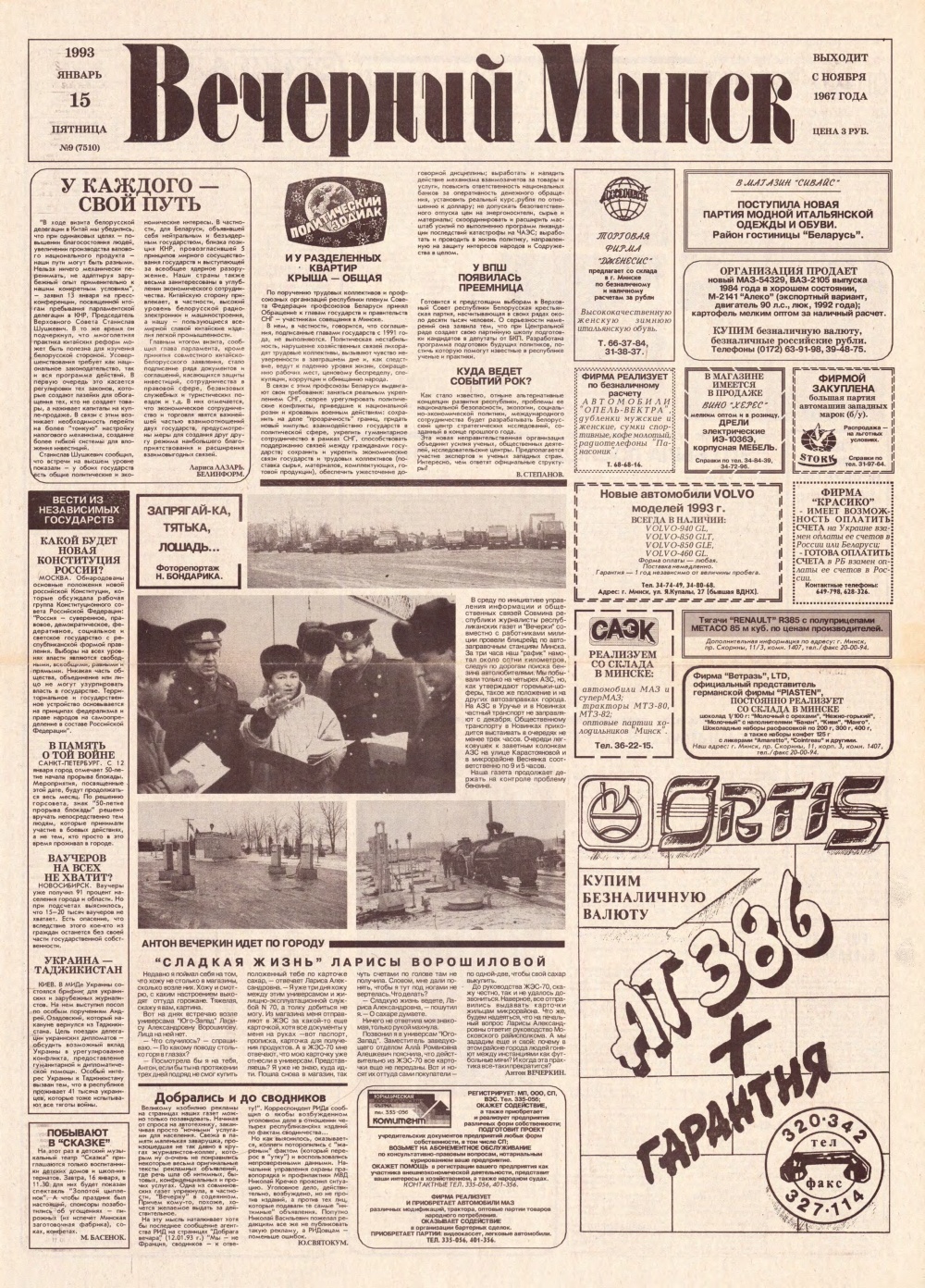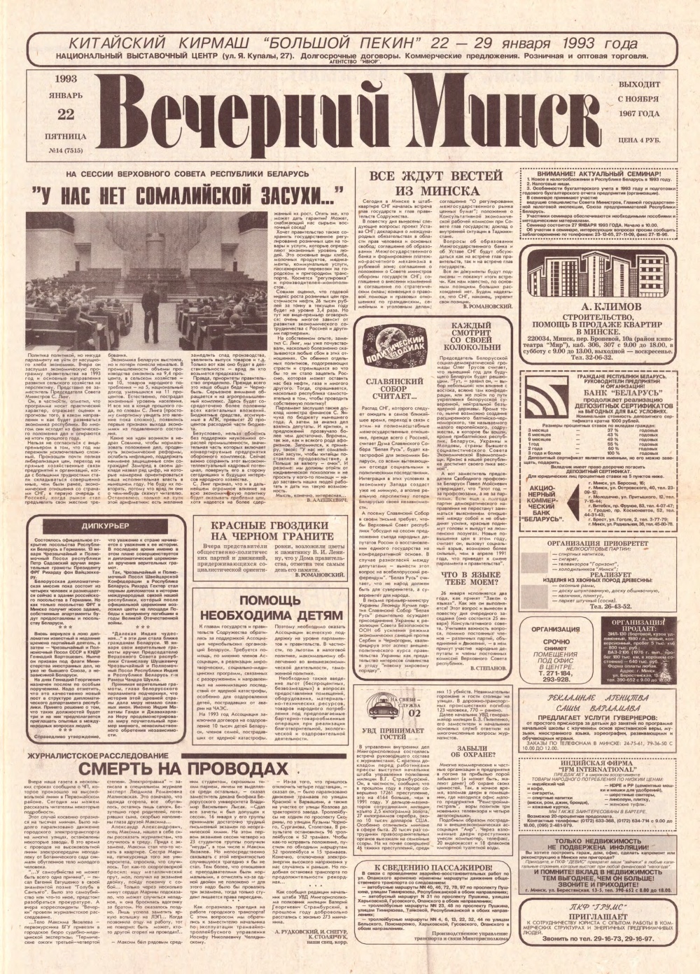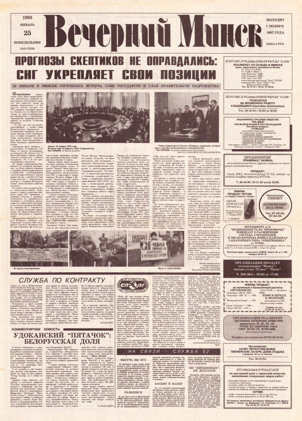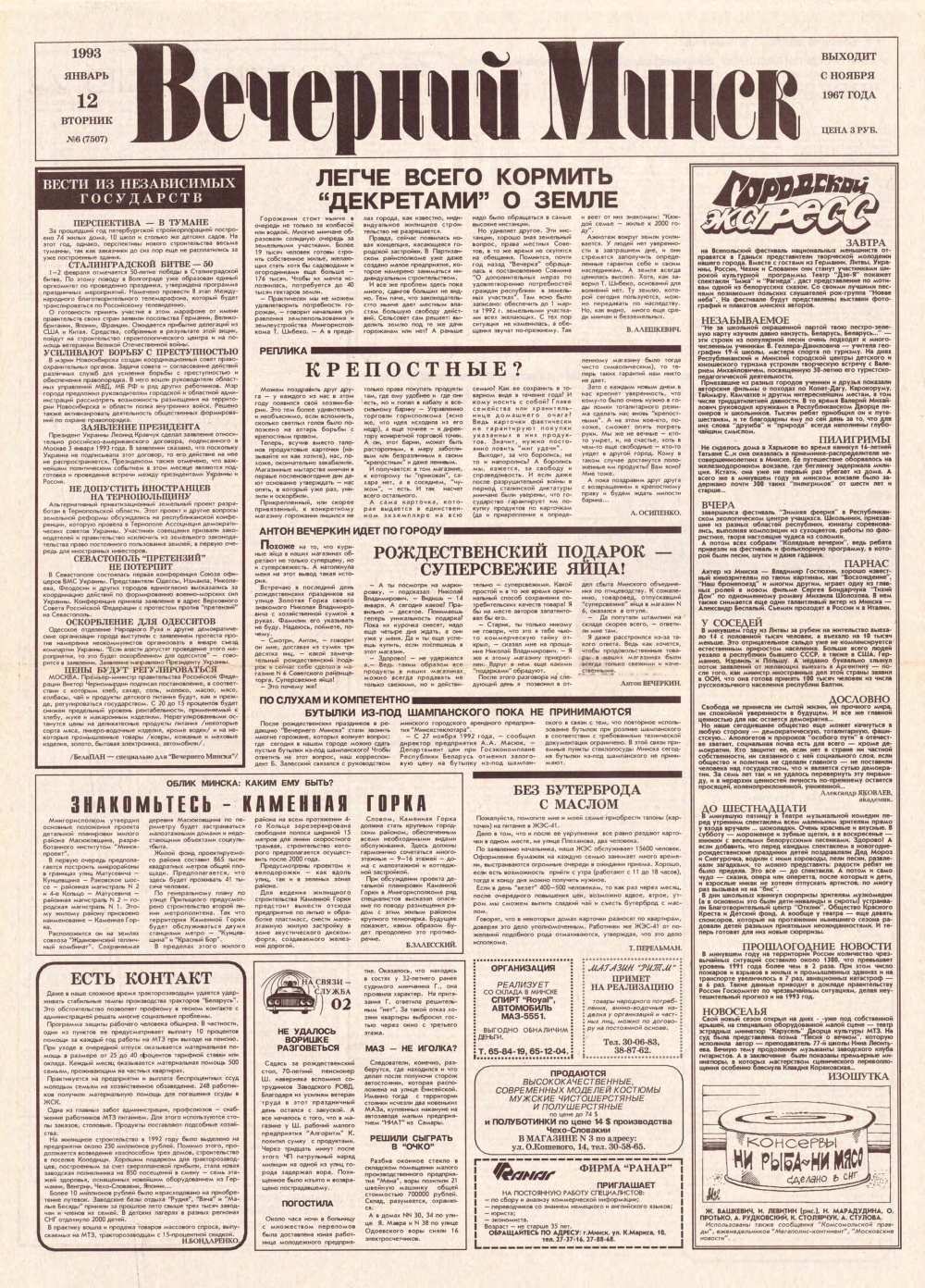 «Вечерний Минск» — выходит з ноября 1967 года. Учредитель: трудовой коллектив редакции газеты «Вечерний Минск». Газета издается на русском и белорусском языках, выходит 5 раз в неделю, кроме субботы и воскресенья — 250 раз в году. Болей »