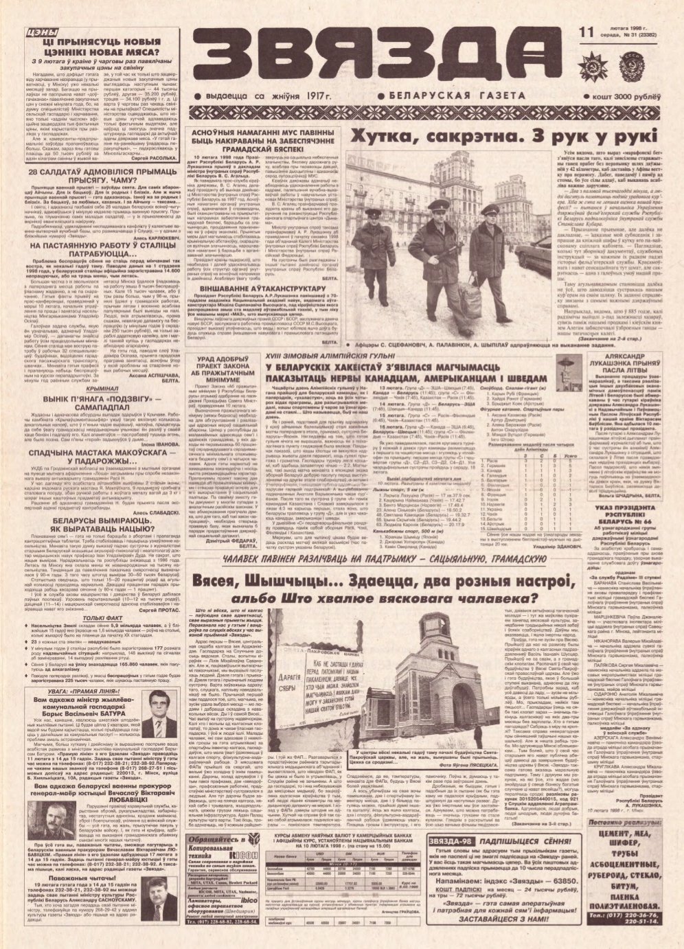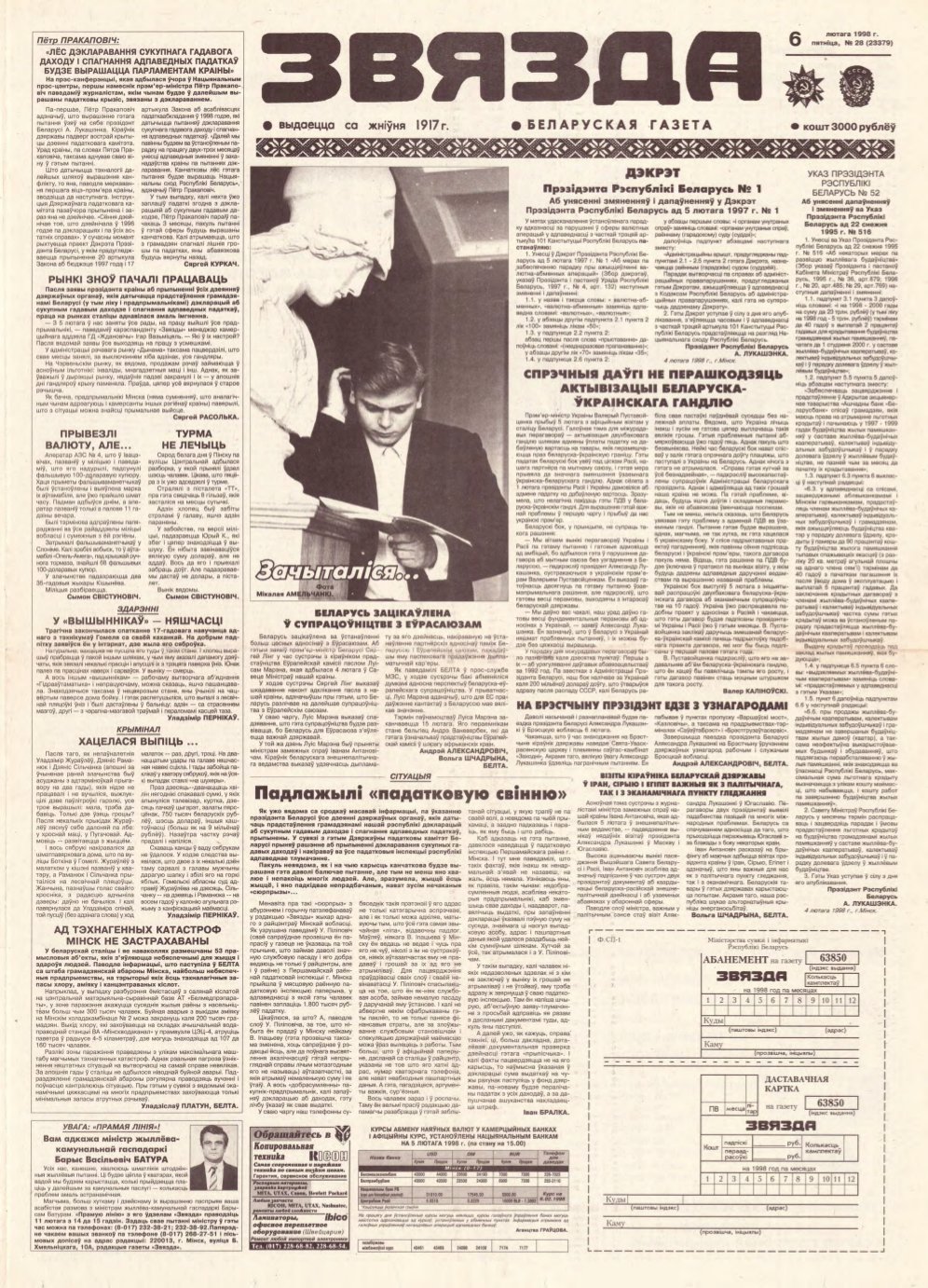 «Звязда» — орган Цэнтральнага Камітэта Камуністычнай партыі Беларусі, Вярхоўнага Савета і Савета Міністраў Беларускай ССР. Выходзіць 250 разоў на год. Аўтары апублікаваных матэрыялаў нясуць адказнасць за падбор і дакладнасць фактаў. Іх меркаванні неабавязкова адлюстроўваюць пункт гледжання рэдакцыі. Болей »