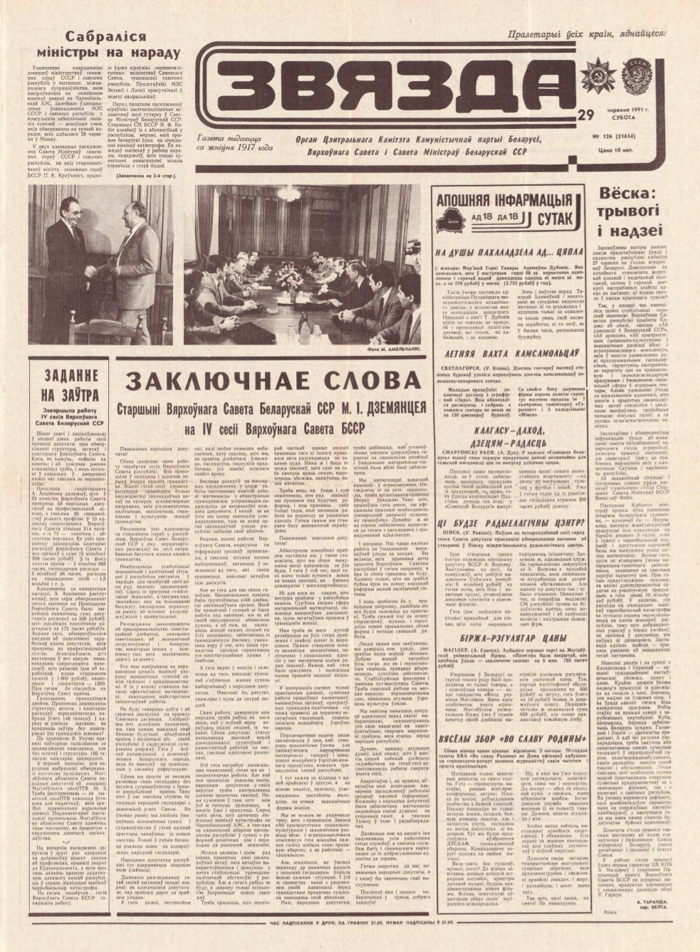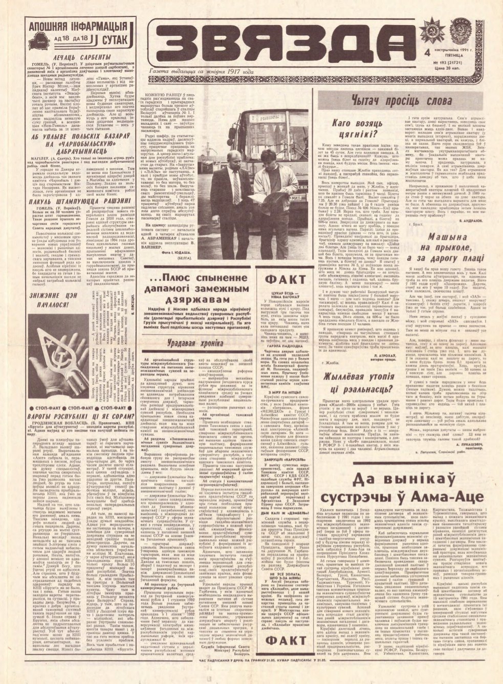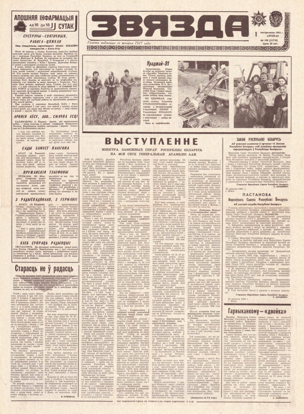 «Звязда» — орган Цэнтральнага Камітэта Камуністычнай партыі Беларусі, Вярхоўнага Савета і Савета Міністраў Беларускай ССР. Выходзіць 250 разоў на год. Аўтары апублікаваных матэрыялаў нясуць адказнасць за падбор і дакладнасць фактаў. Іх меркаванні неабавязкова адлюстроўваюць пункт гледжання рэдакцыі. Więcej »