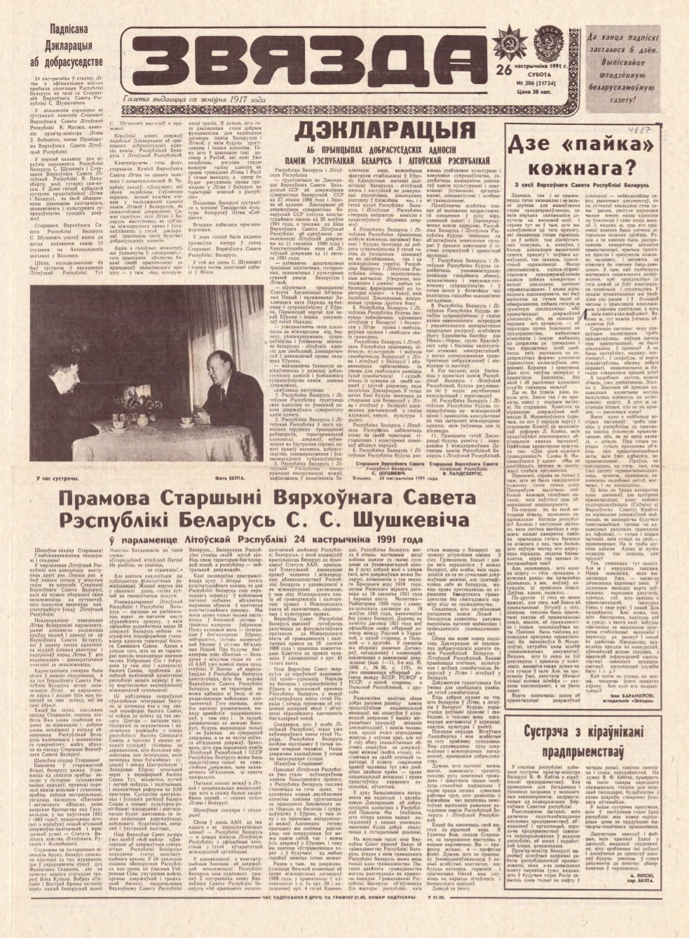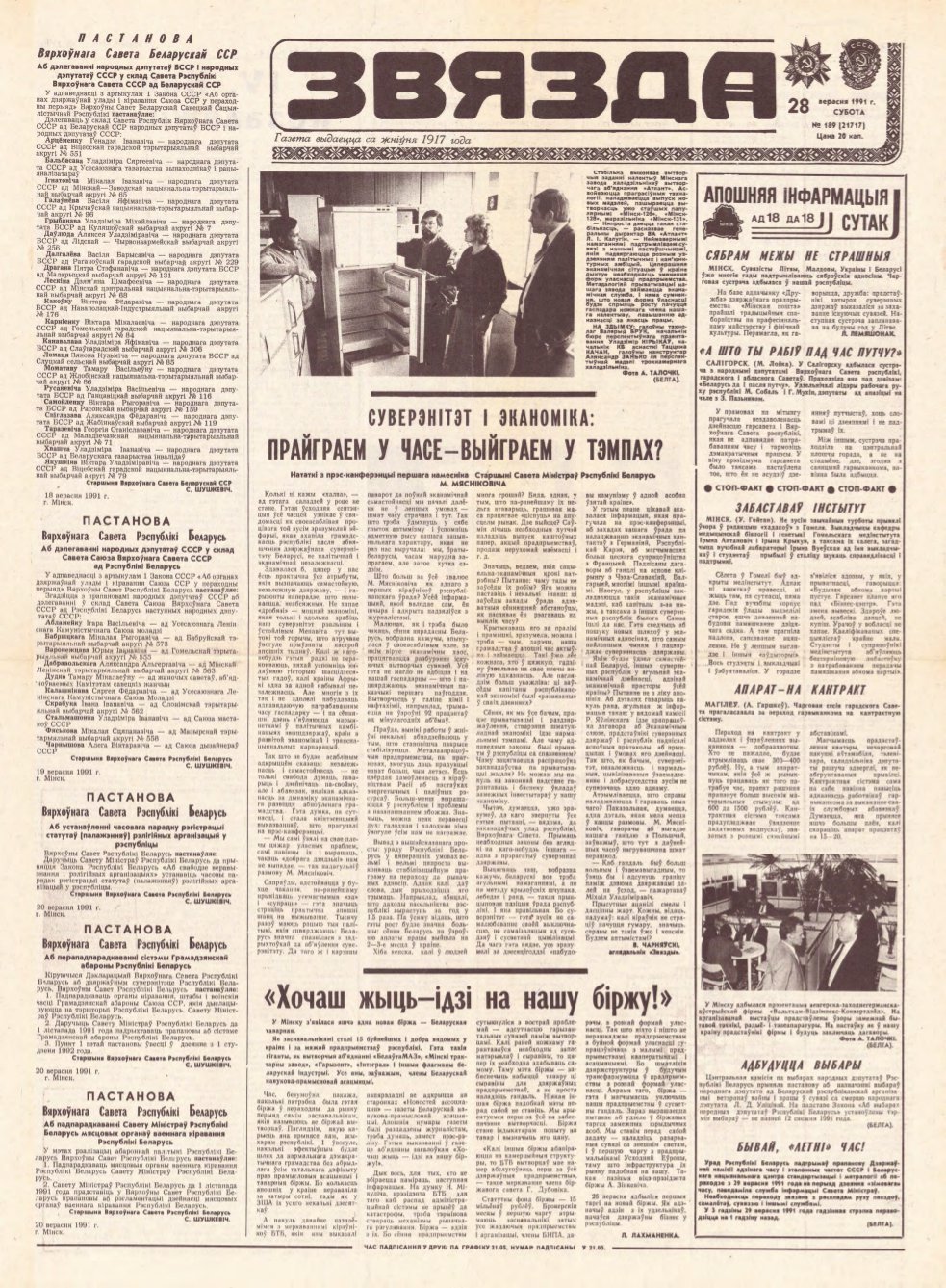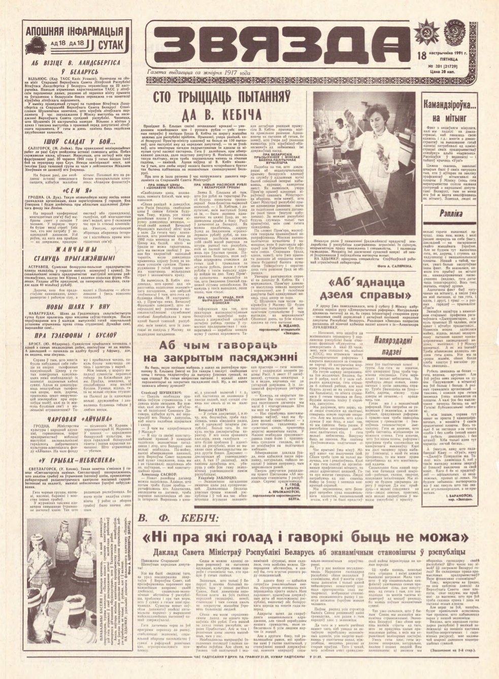 «Звязда» — орган Цэнтральнага Камітэта Камуністычнай партыі Беларусі, Вярхоўнага Савета і Савета Міністраў Беларускай ССР. Выходзіць 250 разоў на год. Аўтары апублікаваных матэрыялаў нясуць адказнасць за падбор і дакладнасць фактаў. Іх меркаванні неабавязкова адлюстроўваюць пункт гледжання рэдакцыі. Więcej »